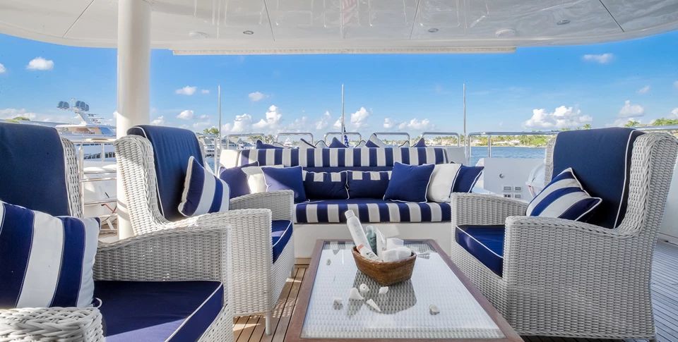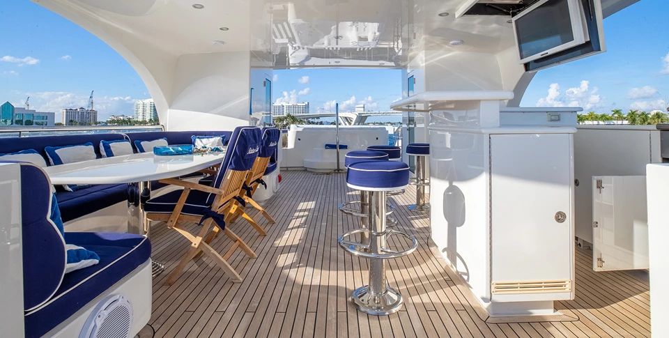 With relevant exterior styling, she features a sizeable skylounge with full bar, gaming table, day head and cozy sitting area and extremely spacious sundeck which serves as the perfect place to relax in the sun or entertain. The deck is expansive, complete with full bar, barbeque, flat screen TV, alfresco dining area, day head, sun pads, custom sauna, and oversized Jacuzzi.