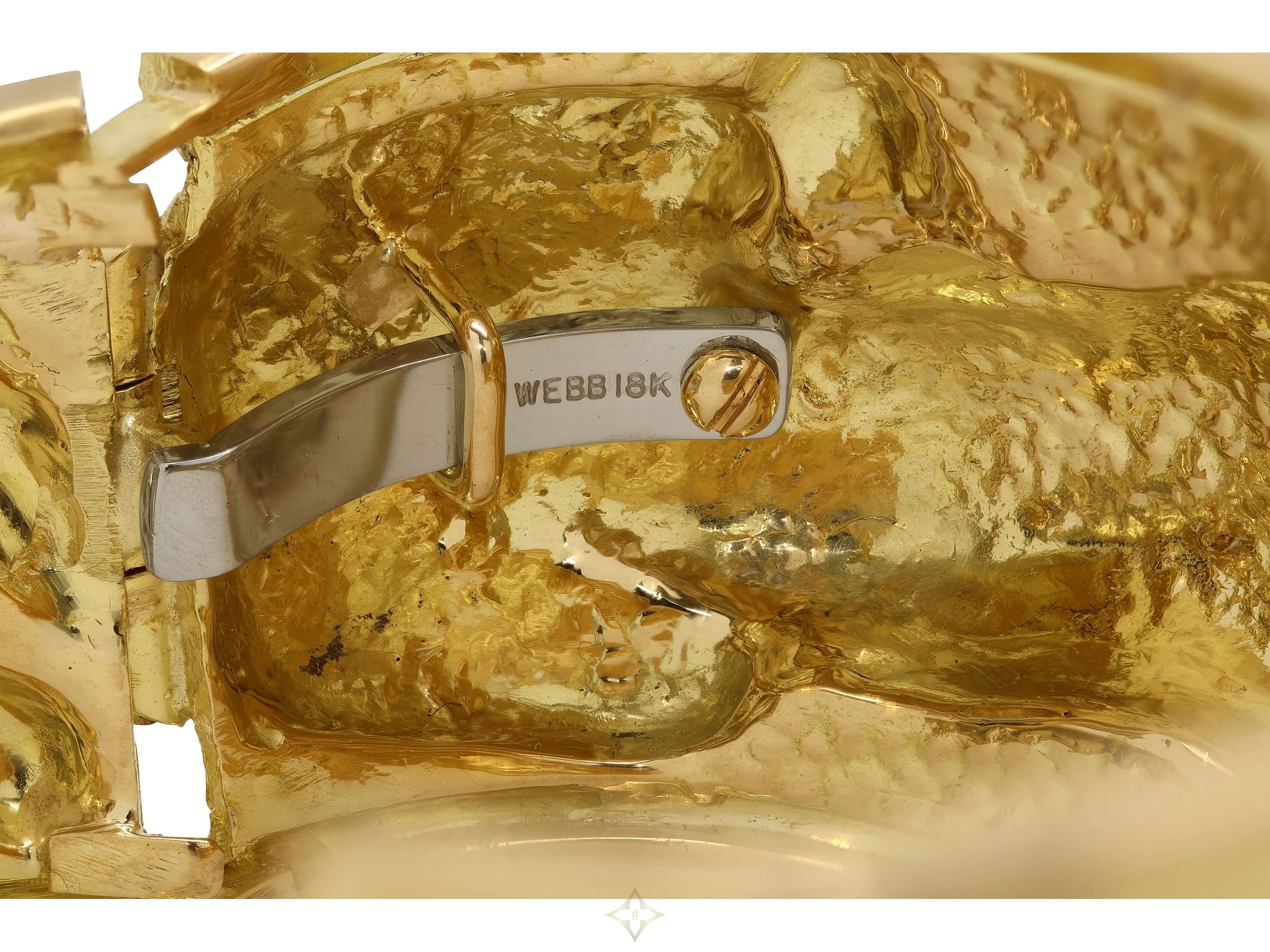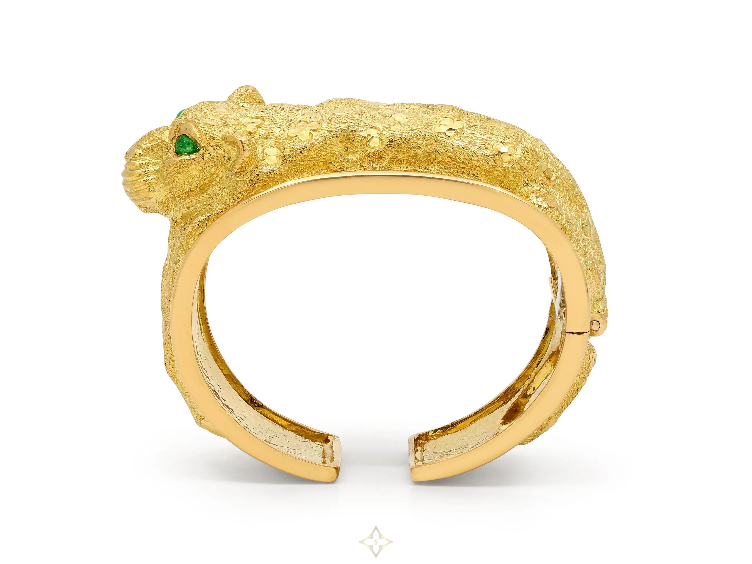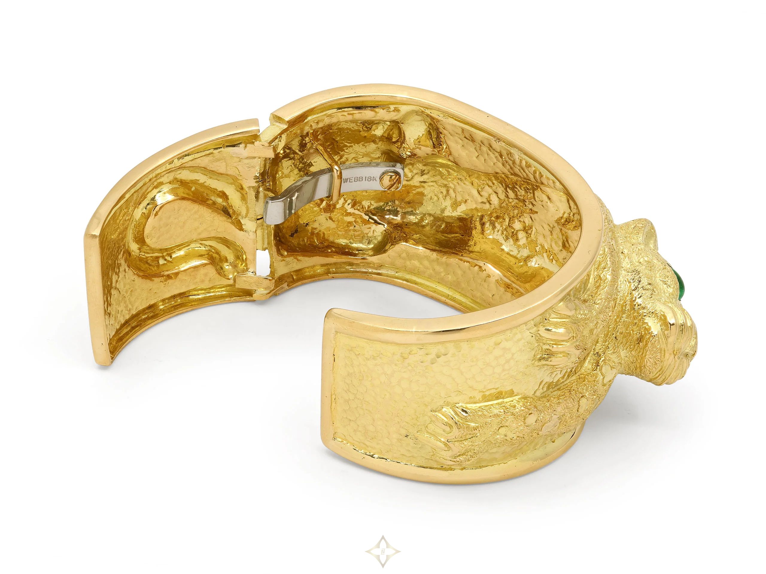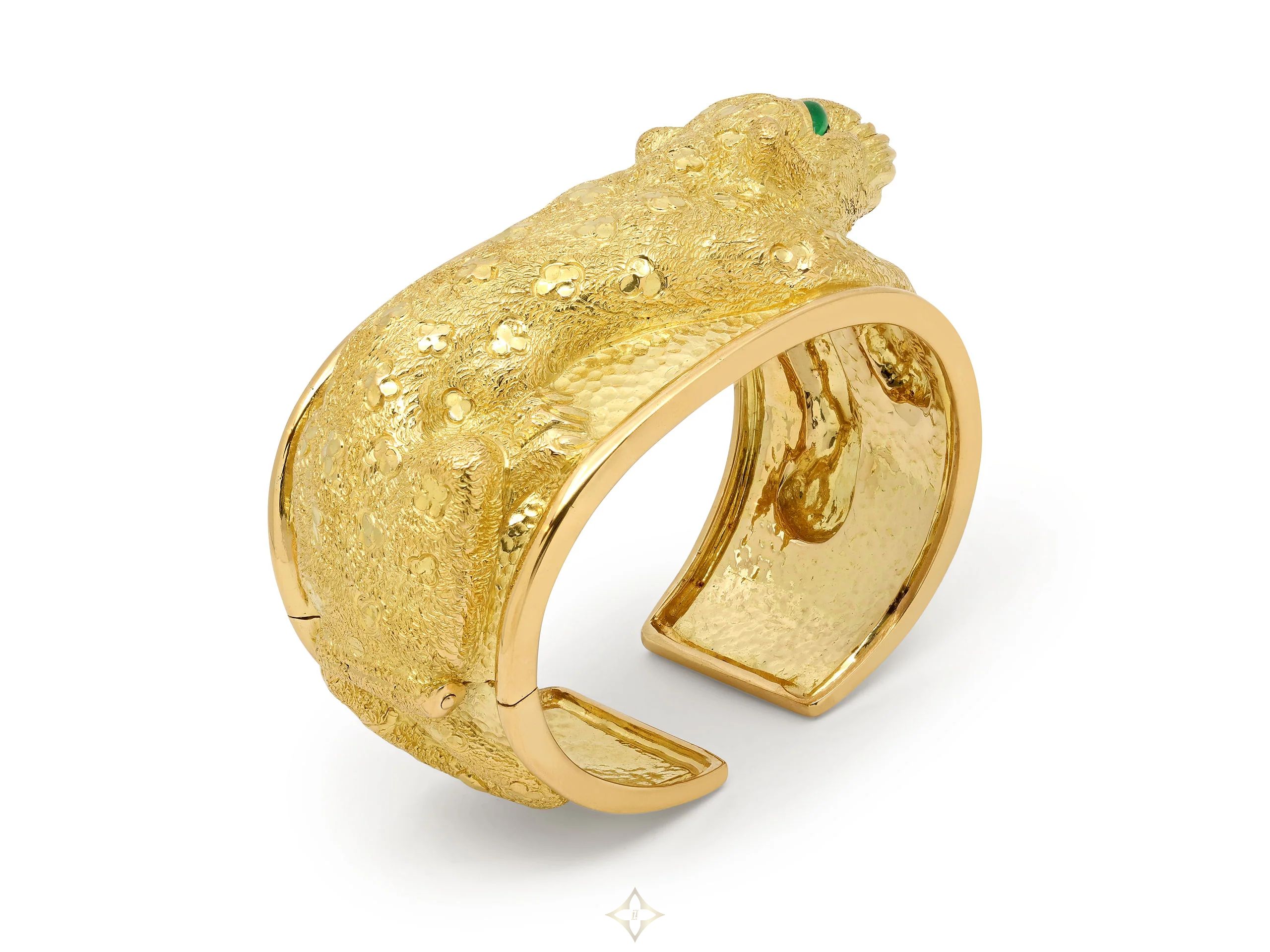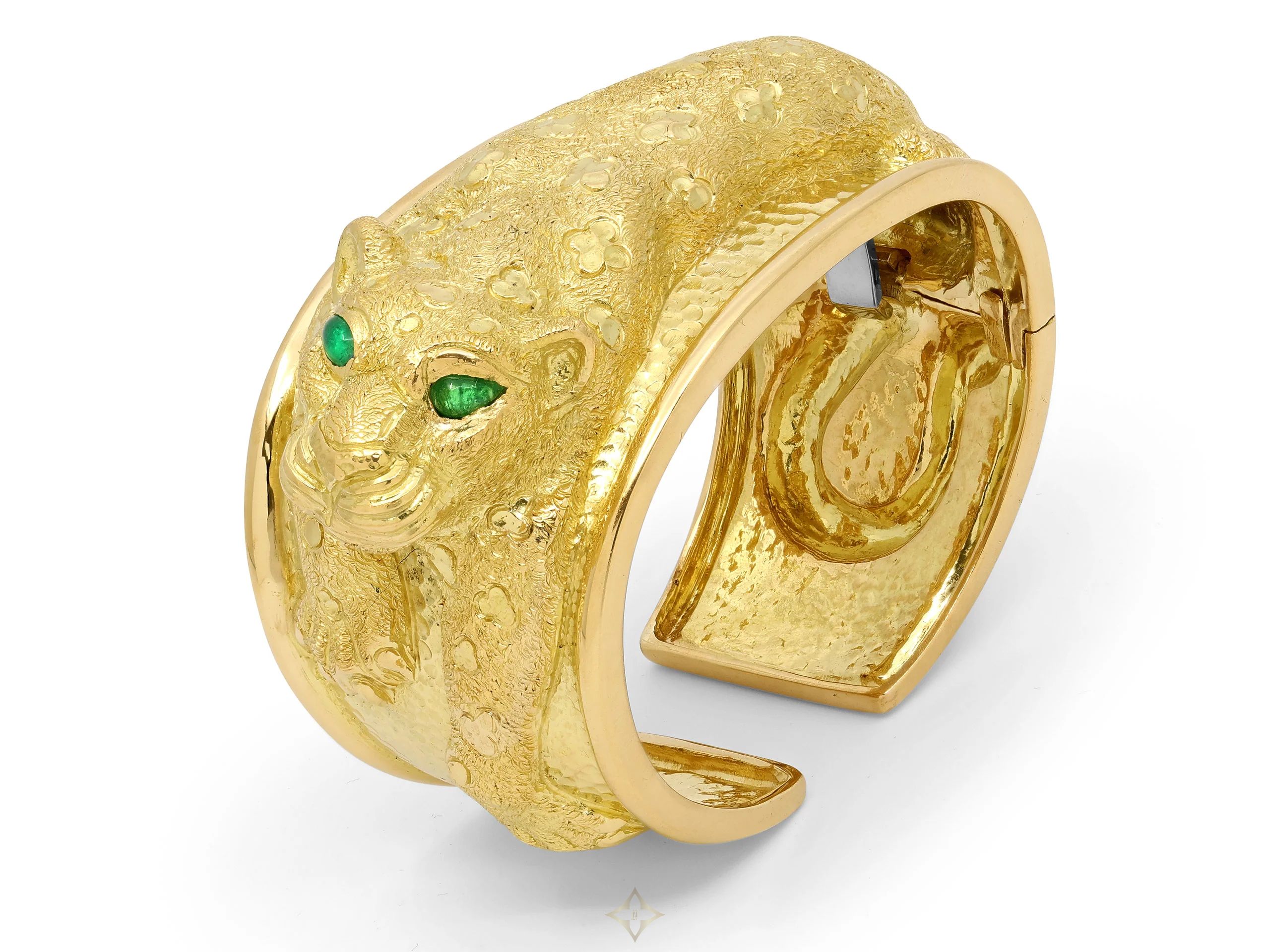 The hinged cuff in hammered finish, with a Leopard motif relief between raised borders, with cabochon emerald eyes, all in 18k yellow gold. Signed Webb.