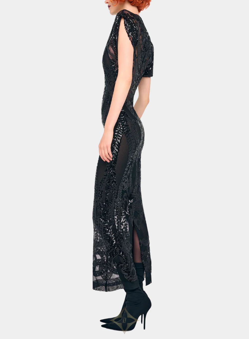 Step into evening elegance with the Norma Kamali Cap Sleeve Long Dress — a striking blend of refined glamour and understated drama. Crafted in a semi-sheer mesh embroidered with shimmering sequins, this long-length silhouette features short cap sleeves, a classic crew neckline, and a sophisticated back slit for ease of movement and statement appeal. A center-back zipper ensures smooth dressing and finish.