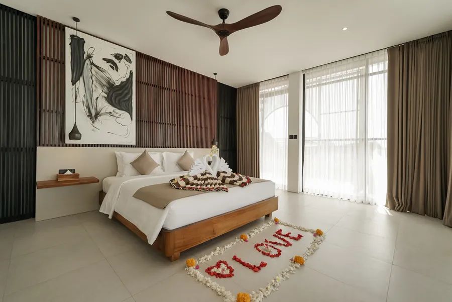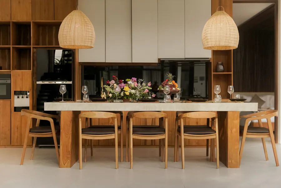 The villa’s modern design features expansive glass walls, soaring ceilings, and warm natural finishes that create a bright, welcoming atmosphere. A spacious enclosed living and dining area offers the perfect space to gather, while the rooftop terrace provides a private haven to enjoy Bali’s iconic sunsets.