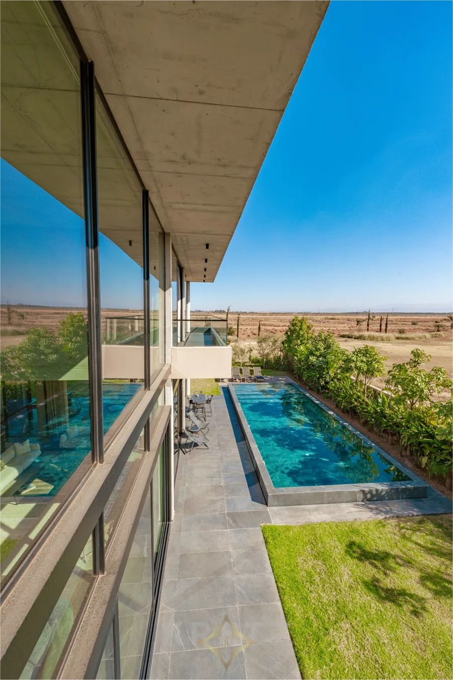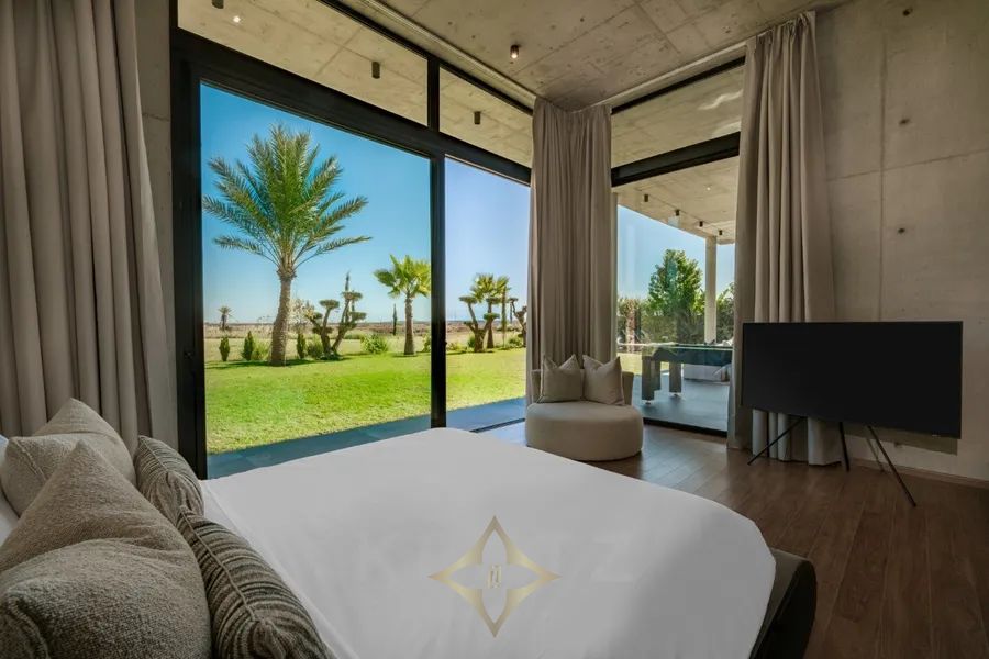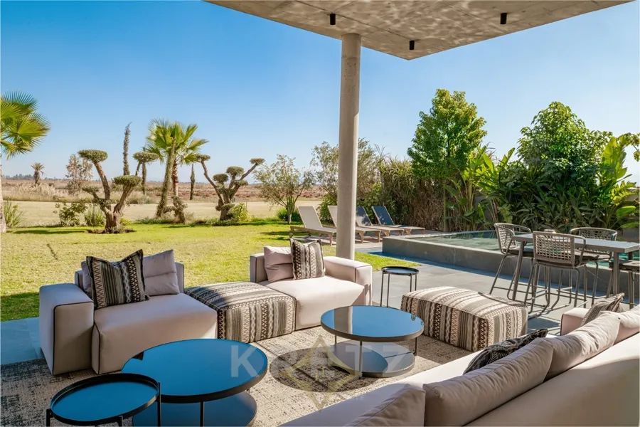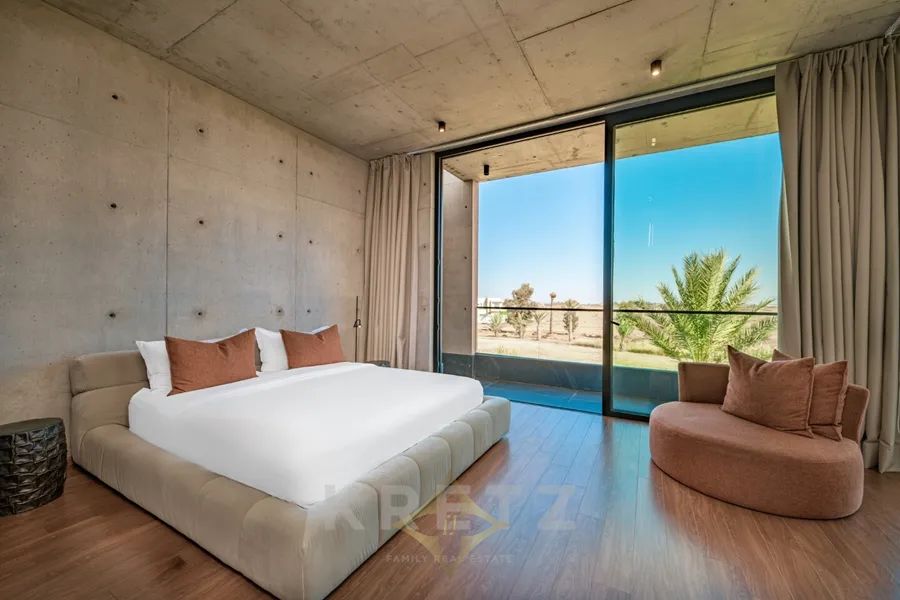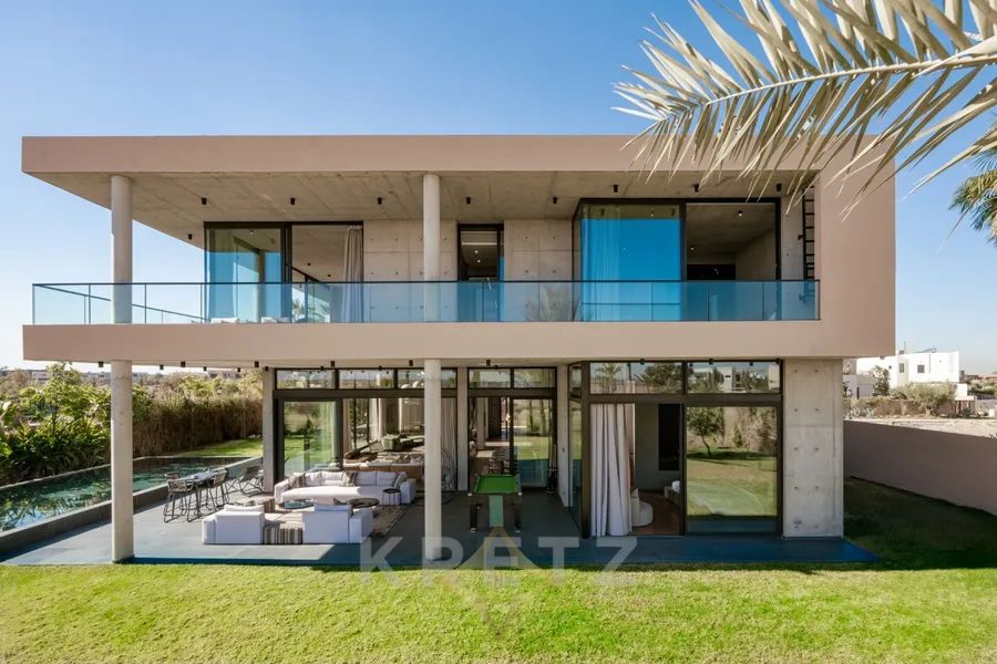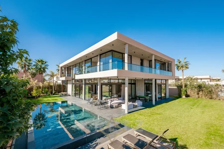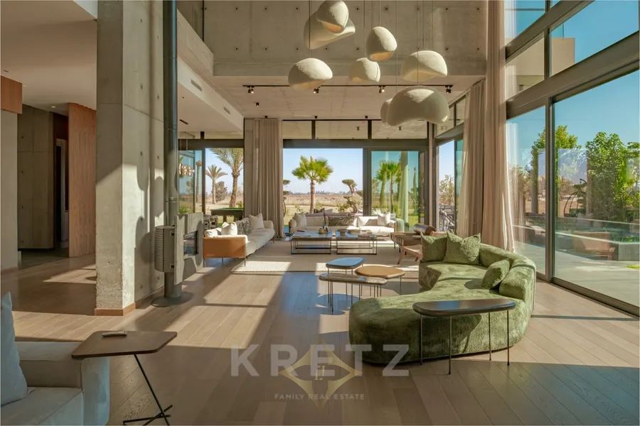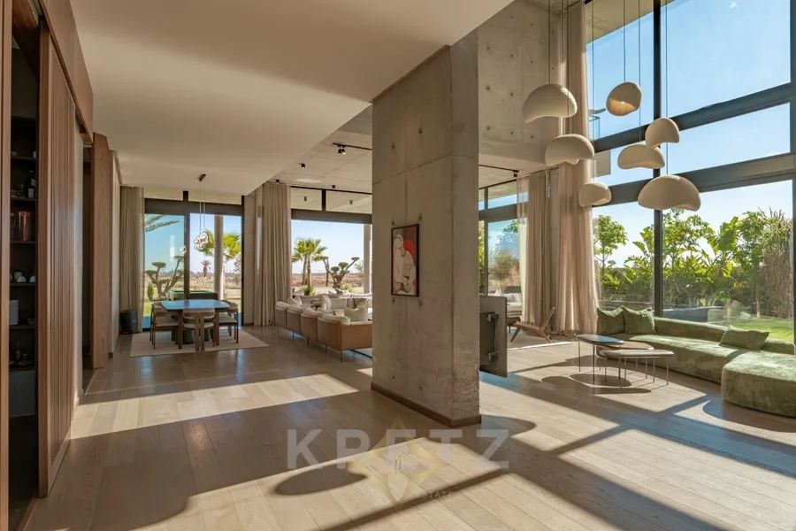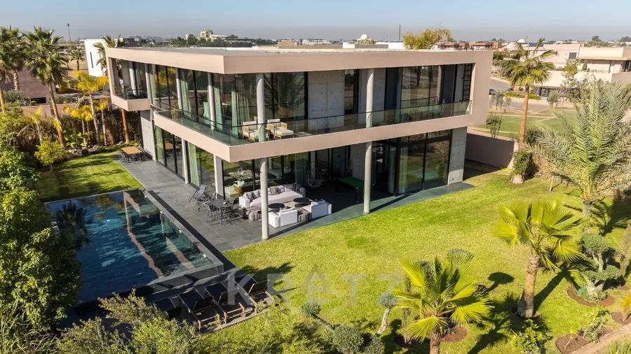 Amelkis golf course. In the heart of a golf course, on a plot of approx. 1200 m², 600 m² architect-designed villa on 2 levels with pool and garden overlooking the golf course. Panoramic views of the Atlas Mountains and golf course. Unique architecture designed with top-of-the-range materials.