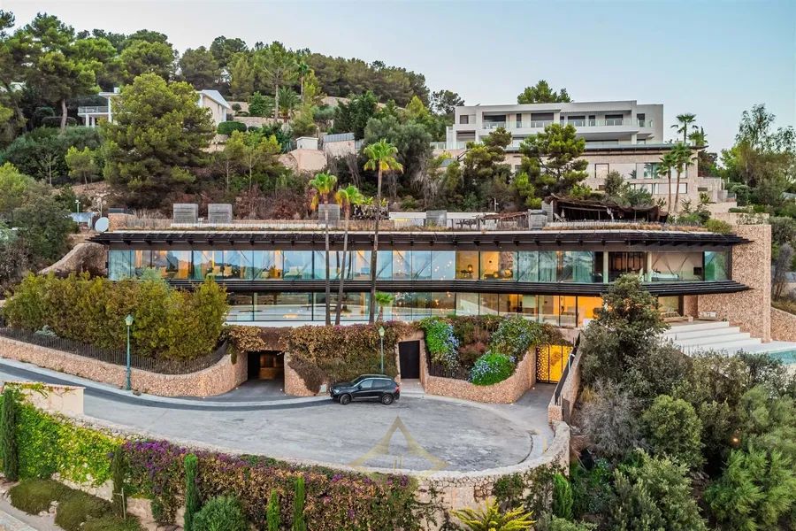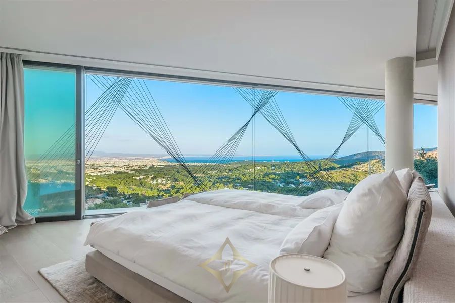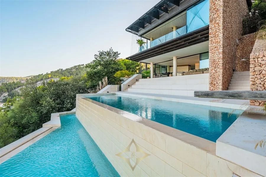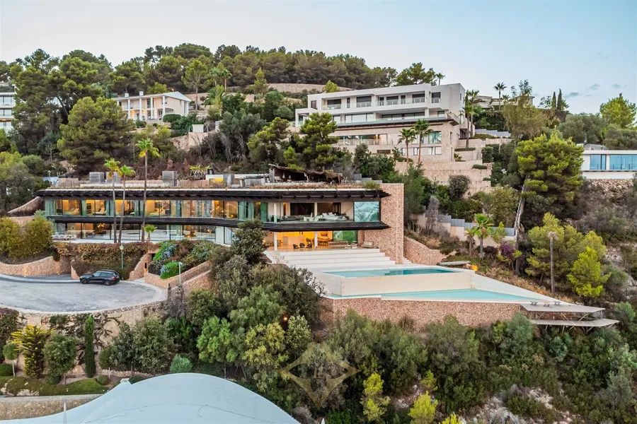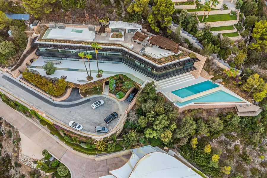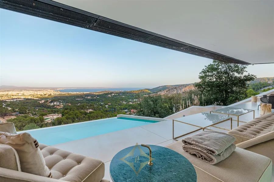 Introducing Villa Solitaire. Nestled atop the exclusive hill of Son Vida, in what is often referred to as the Beverly Hills of Mallorca, stands a luxurious villa that epitomizes opulence and architectural brilliance. This masterpiece, meticulously designed by the renowned architect Matteo Thun, commands the most coveted position in this exclusive residential haven. Elevated on the pinnacle of Son Vida, this property ensures the utmost privacy, allowing you to bask in the lap of luxury without disturbance. With its southern orientation, the villa enjoys an uninterrupted embrace of the sun’s warmth from dawn to dusk, creating a perpetual ambiance of comfort and tranquility. Enveloped by vast expanses of glass fronts, the villa’s grandeur extends beyond its walls. Feast your eyes on an awe-inspiring panorama that sweeps over the sparkling waters of the Palma bay. You’ll find yourself captivated by the natural beauty that graces this unparalleled residence. Step inside this sprawling villa, where indulgence knows no bounds. With a total of seven spacious bedrooms, each an oasis of comfort and style, this haven ensures that both residents and guests find solace in luxury. Discover not just one, but two lavish pool areas that beckon you to unwind and refresh in absolute seclusion. The sprawling terrace, spanning approximately 2000m², presents an alfresco haven where you can enjoy in the Mediterranean breeze and the gentle kiss of the sun. Spanning across four meticulously crafted floors, this villa is a testament to thoughtful design and unmatched elegance. The ground floor boasts a spacious living area, an inviting dining space, and not one, but two fully equipped kitchens—a culinary aficionado’s dream. A wine cellar and bar await, promising evenings of fine sips and delightful conversations. Ascending to the first floor reveals a sanctuary of tranquility. Impeccably appointed bedroom suites and their accompanying en-suite bathrooms offer respite in the lap of luxury, ensuring that every moment spent here is one of sheer indulgence. Venture to the basement, where a world of wellness and relaxation awaits. Immerse yourself in a realm of serenity as you explore a zen garden, a fully-equipped gym, a rejuvenating sauna, a steam bath, and a lavish massage room. And for those seeking refuge, a separate staff wing with two bedrooms ensures that every need is met. For the connoisseur of automotive elegance, a sprawling garage accommodating up to 7 vehicles stands ready to house your prized collection. And as the crowning jewel, the rooftop terrace invites you to experience cinematic enchantment beneath the stars. An open-air, tulum inspired cinema sets the stage for unforgettable evenings, while a bubbling jacuzzi invites you to soak away your cares in the lap of luxury. Indulge in a lifestyle beyond compare, where every facet of luxury living is brought to life in this exceptional villa atop Son Vida. A creation of architectural brilliance, a haven of relaxation, and an embodiment of elegance, this residence stands as a testament to your discerning taste and uncompromising standards. Welcome to a life where opulence knows no bounds.