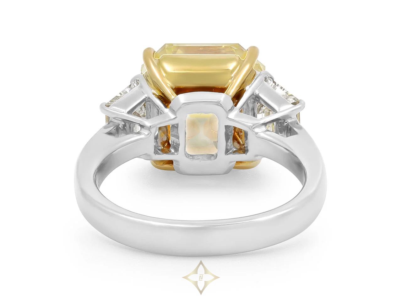 The 8.17 carat Asscher-cut yellow diamond prong-set in 18k yellow gold, with trapezoid diamond side stones weighing 1.30 carats, in a platinum mounting. Accompanied by a GIA (Gemological Institute of America) report stating that the Asscher-cut diamond is Fancy Intense Yellow Natural in color, VS-2 clarity.