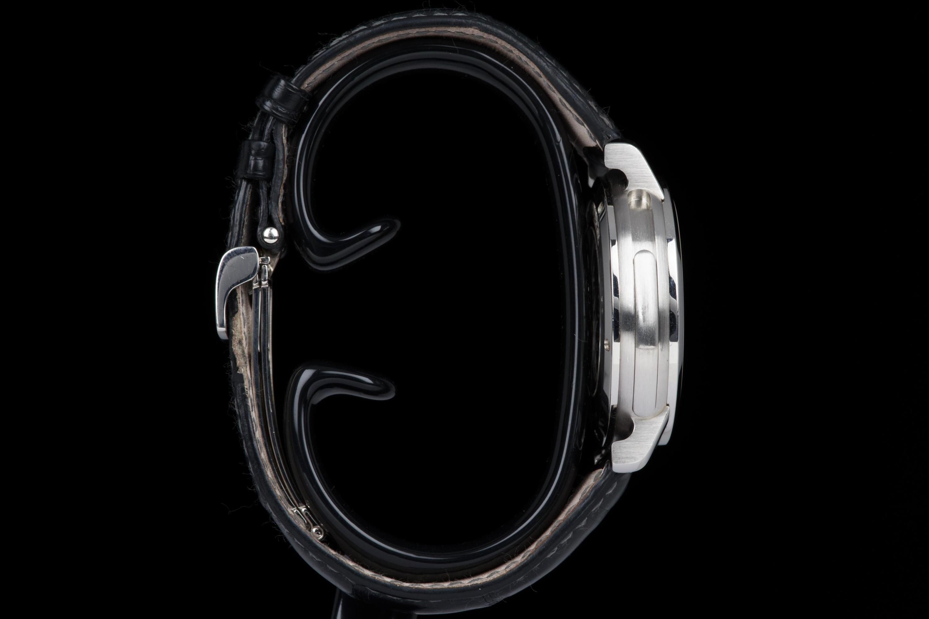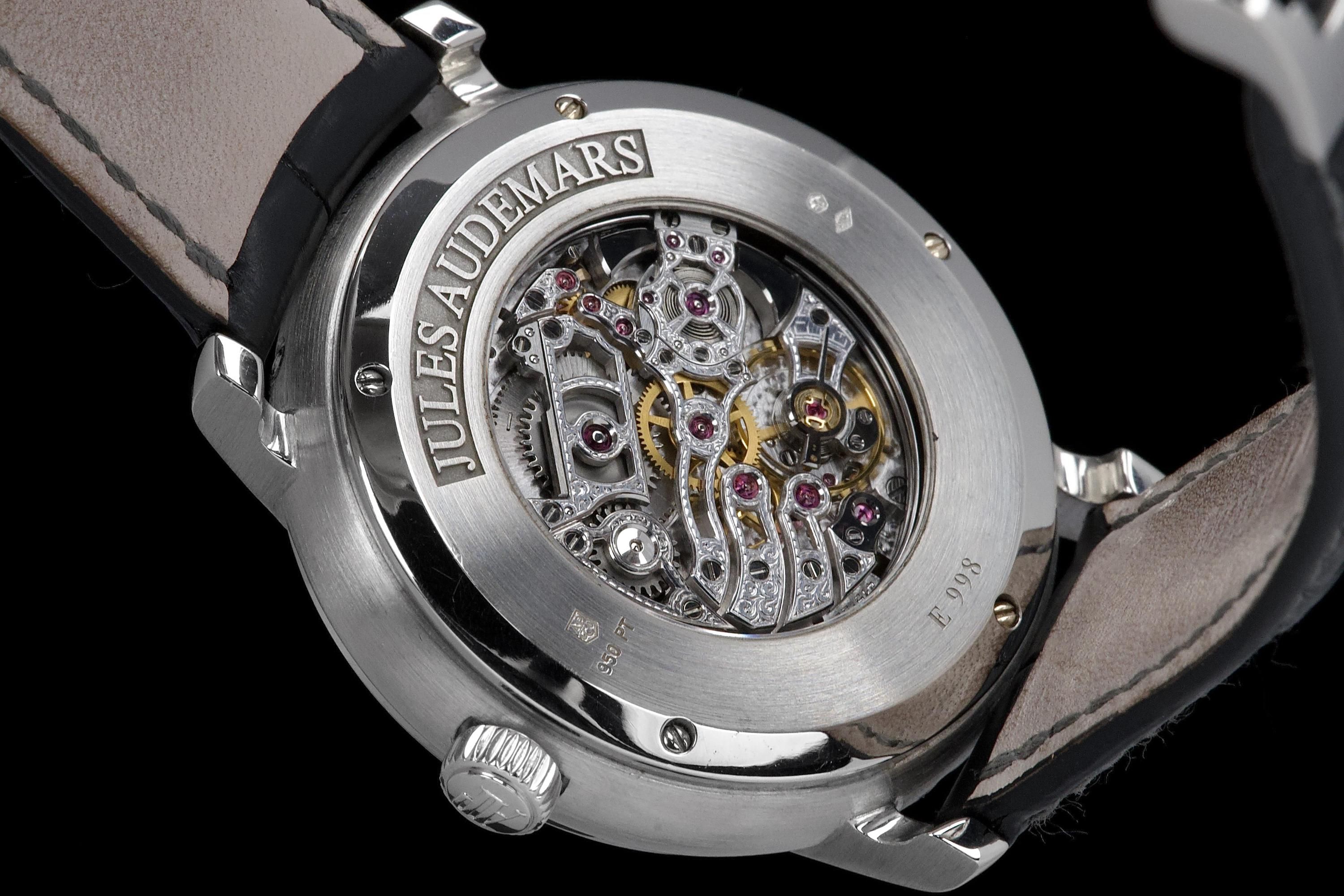 The present Audemars Piguet Jules Audemars Minute Repeater Perpetual Calendar Skeleton, dating to 2007, is an extraordinary and exceptionally rare high complication, produced in a limited edition of only nine pieces worldwide. Executed in platinum and measuring 39 mm in diameter, this watch represents one of the most technically ambitious and visually striking creations of Audemars Piguet’s modern era. The platinum case is preserved in good overall condition and shows signs of wear consistent with careful use, lending the watch an honest and lived-in presence. The watch is powered by a manual-winding movement combining a minute repeater with a perpetual calendar, both fully skeletonized. This openworked architecture reveals the extraordinary complexity of the mechanism, allowing the wearer to admire the meticulous finishing, hand-beveling, and traditional decorative techniques for which Audemars Piguet is renowned. The dial side is distinguished by a refined grey-toned chapter ring, accented by three Roman numerals, framing the skeletonized movement beneath. The leaf-shaped hands in grey gold add elegance and legibility while maintaining harmony with the monochromatic platinum aesthetic. The acoustic performance of the minute repeater is complemented by the visual drama of the openworked perpetual calendar displays, resulting in a watch that is as captivating to observe as it is to hear. The watch is fitted with a black Audemars Piguet crocodile leather strap, secured by a platinum deployant clasp, ensuring both comfort and material coherence. It is accompanied by an Audemars Piguet Certificate of Authenticity issued in 2025, which confirms production of the watch in 2007. Combining extreme rarity, supreme technical complexity, and bold aesthetic presence, this Jules Audemars Minute Repeater Perpetual Calendar Skeleton stands as a truly impressive and museum-worthy creation—an exceptional opportunity to acquire one of the most exclusive platinum complicated wristwatches ever produced by Audemars Piguet.