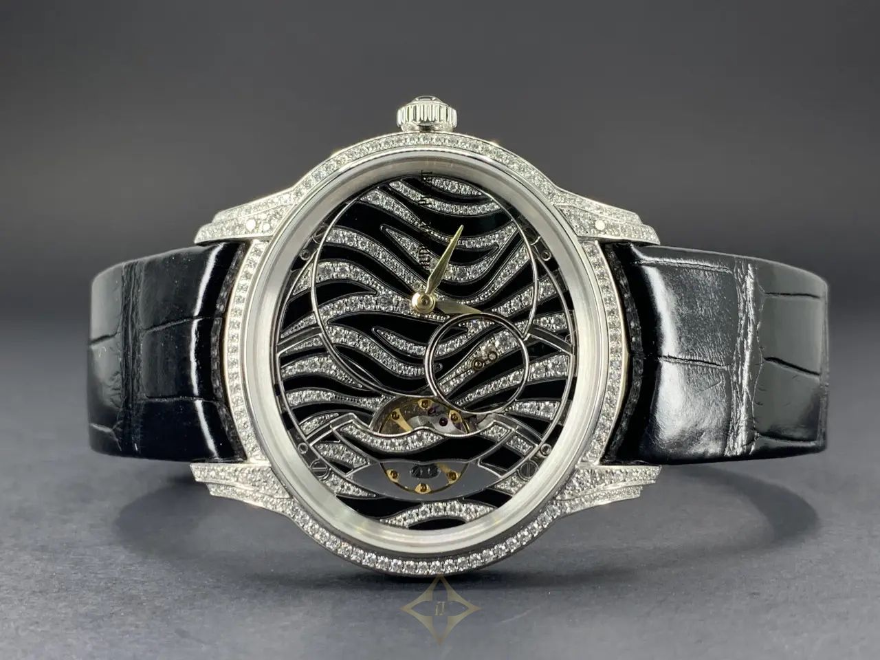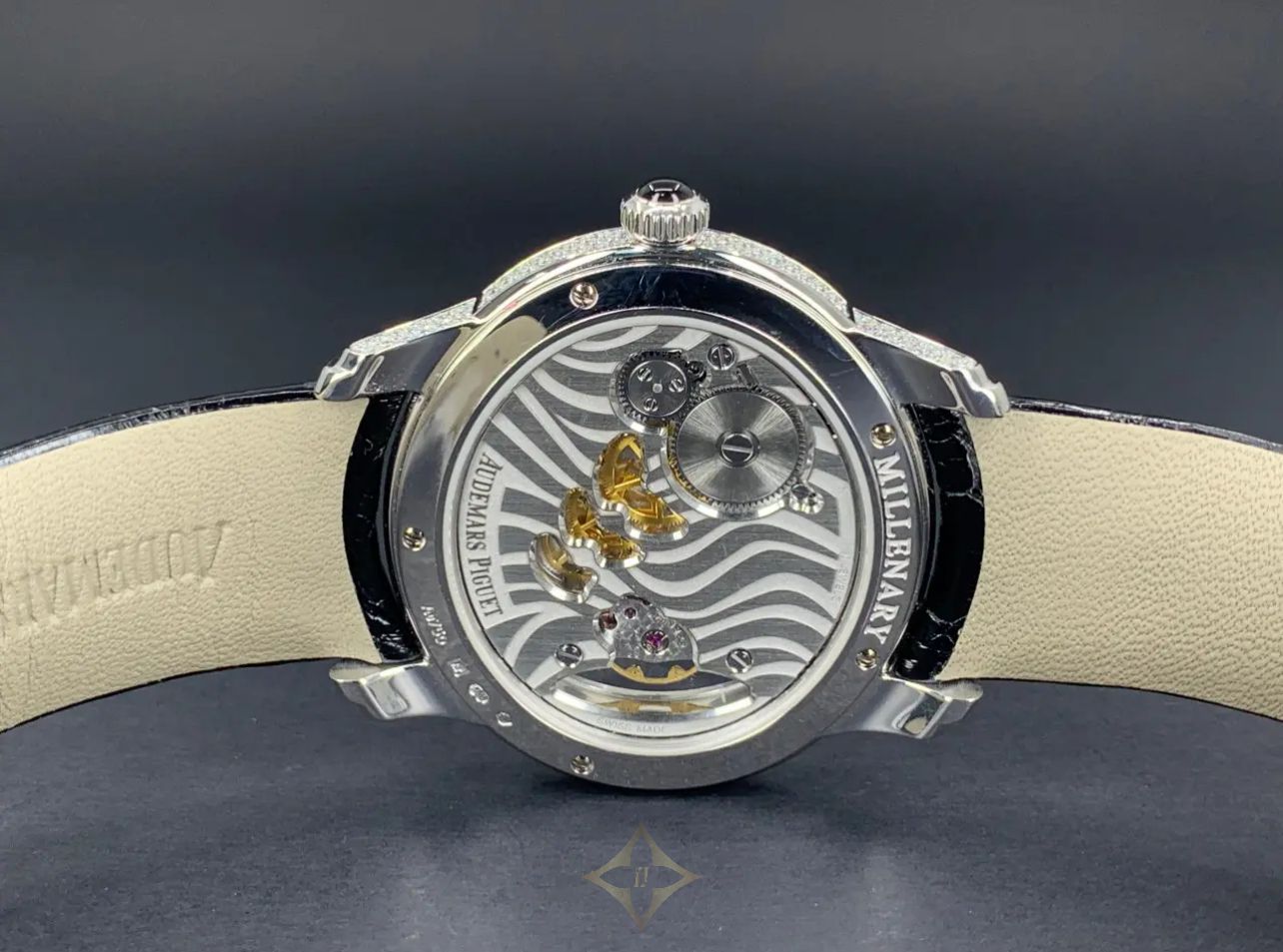 Dial: The dial presents a captivating "Zebra" pattern, achieved through a combination of diamonds and onyx set in 18-carat white gold. This intricate design not only adds visual intrigue but also highlights the meticulous attention to detail characteristic of Audemars Piguet.