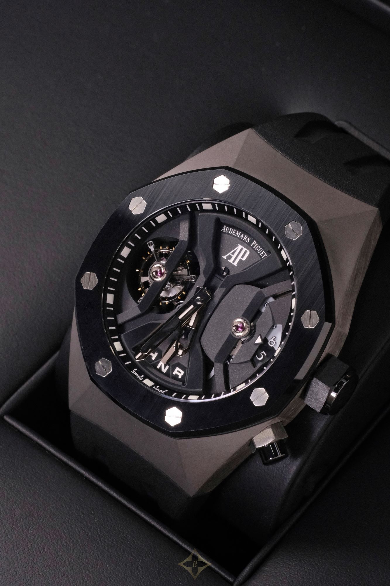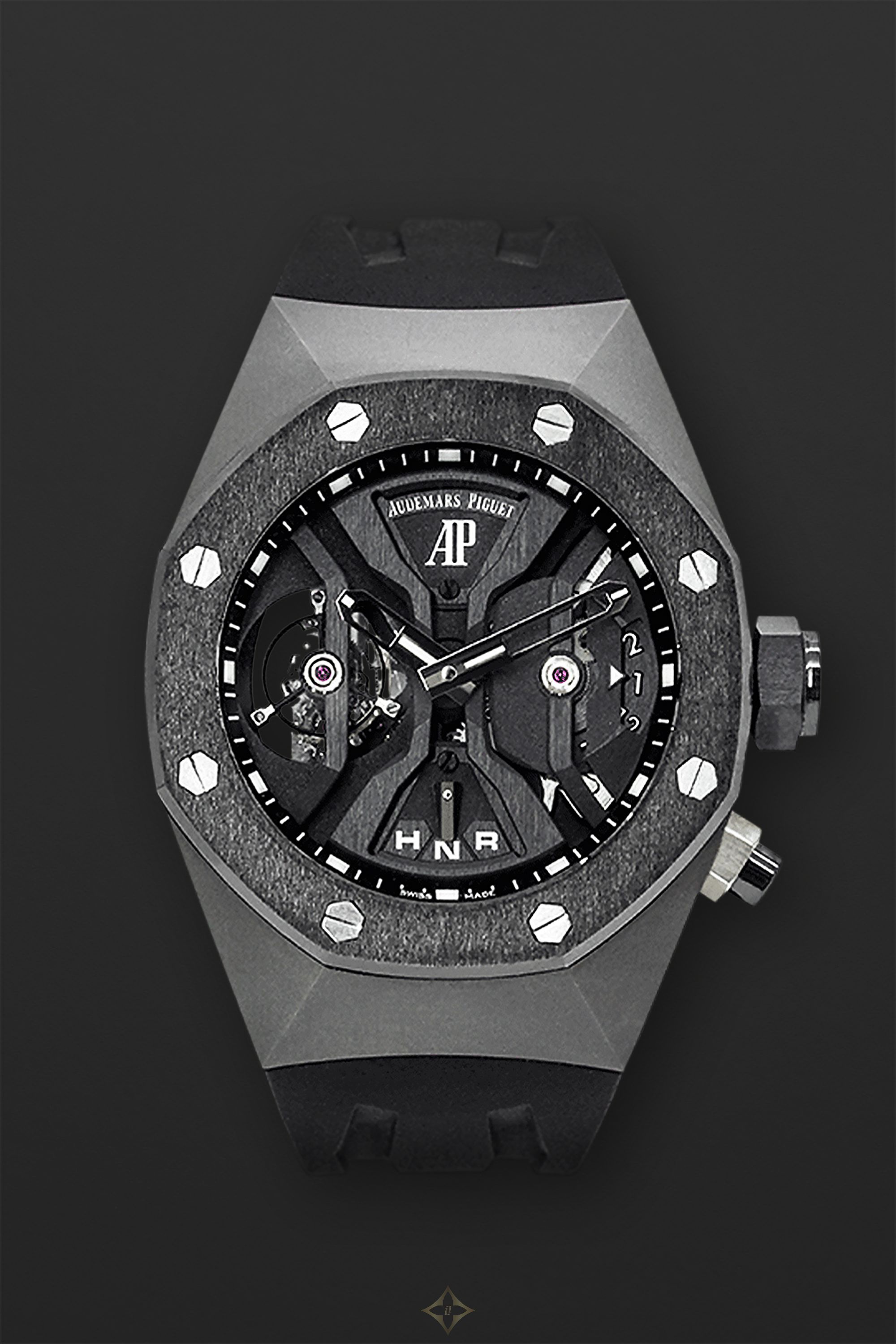 Dial: Black open-worked dial, signed ‘AP Audemars Piguet’, hour and minute track on outer inclined ring, wide open-worked ‘obelisk’ hour and minute hands, luminous, tourbillon opening at 9 o’clock, crown function indicator at 6 o’clock, digital wandering 12-hour and am/pm GMT indicators at 3 o’clock