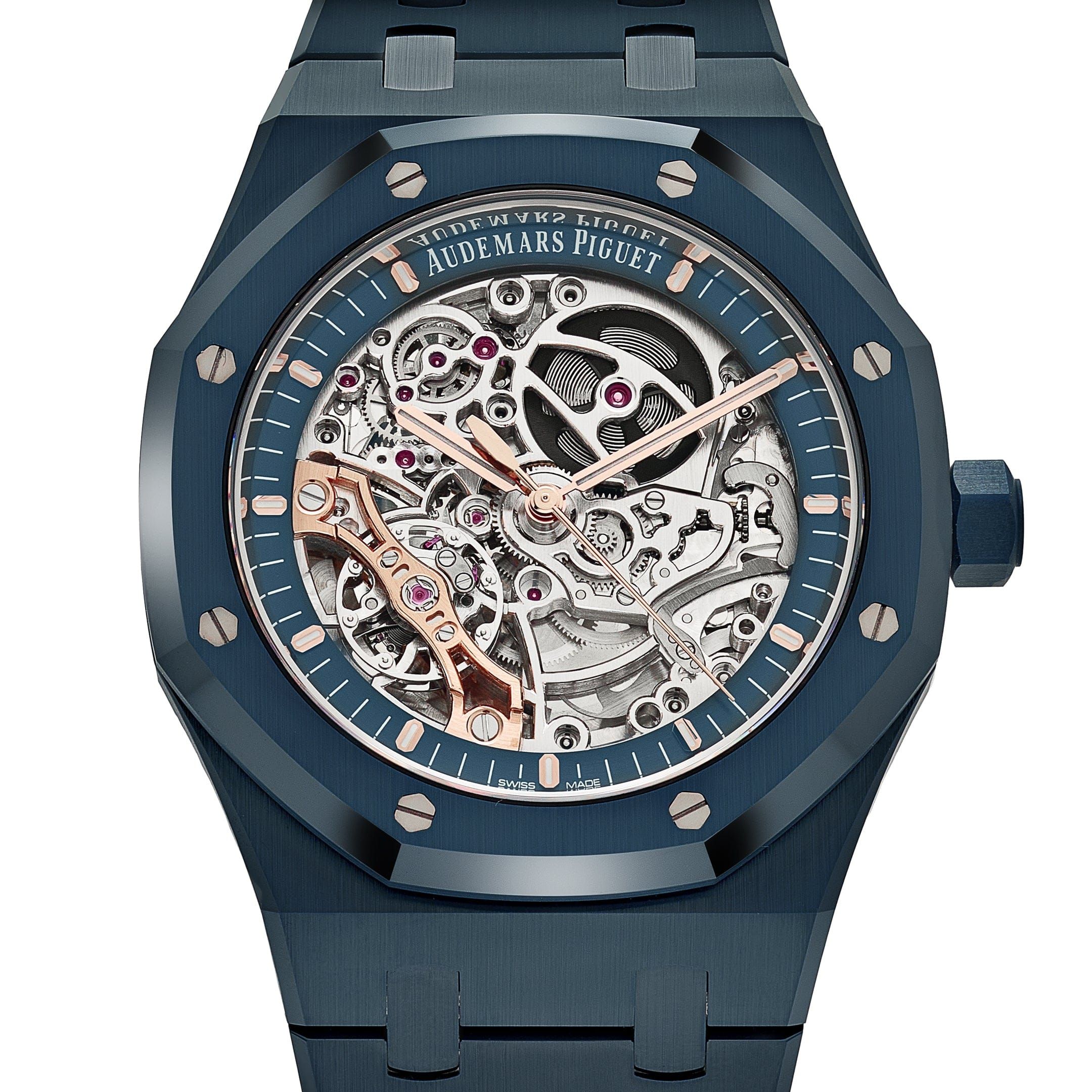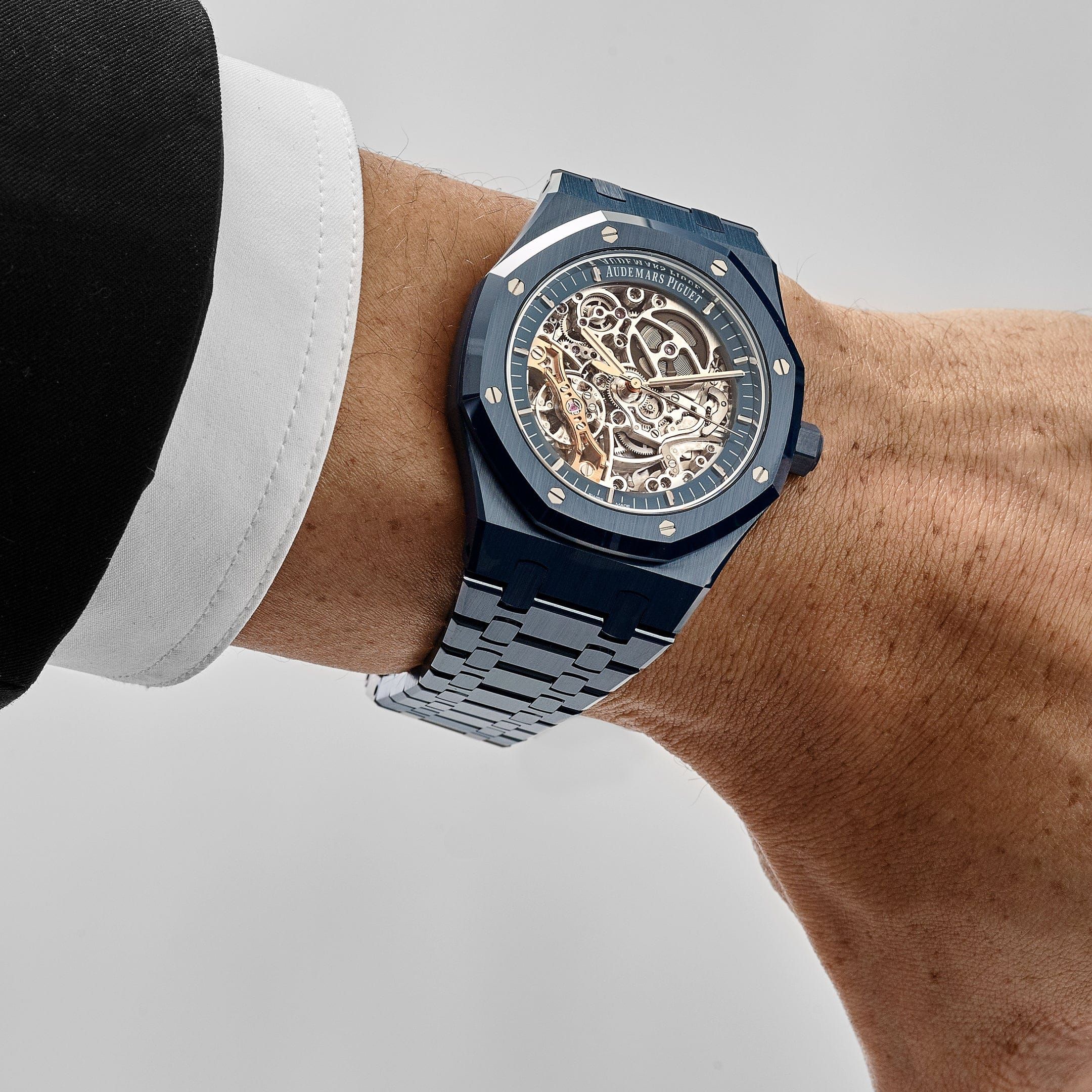 The dial reveals the ultra-modern Caliber 3132, showcasing the dual balance wheel mechanism, a patented innovation designed to improve precision and stability. Skeletonized and exquisitely hand-finished, the movement bridges are treated in complementary tones that contrast beautifully against the rich blue ceramic, emphasizing the depth and technical artistry of the watch. With its fusion of cutting-edge engineering, bold design, and high-complication craftsmanship, the 15416CD represents a monumental step forward in the evolution of the Royal Oak—crafted for collectors who demand both performance and presence at the highest level.