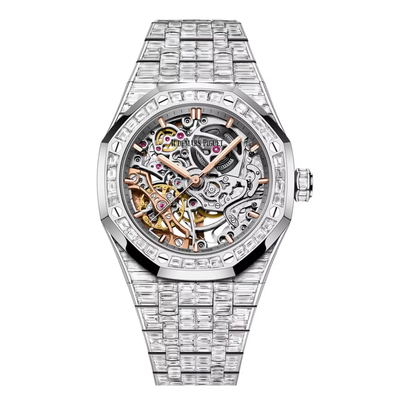 Audemars Piguet Royal Oak 15469BC.ZZ.1260BC.01-A “Chandelier” Double Skeletonized Balance Wheel PRICE: $1,340,560.00 AP 15469BC.ZZ.1260BC.01-A A full pavé diamond bezel and lugs elevate this 18 ct white‑gold Royal Oak, showcasing Calibre 3132’s double balance through a sapphire dial. Though haute joaillerie, it retains 20 m splash protection, a fold‑clasp bracelet, and AP’s engineering pedigree for reliable daily timing. SKU: WMD-AP-4137 SPECIFICATIONS Clasp: Fold clasp Functions: Hours, minutes, central seconds Model: 15469BC.ZZ.1260BC.O1-A Movement: Selfwinding Water resistance: 20 m Year: 2024 Band Type: Bracelet Gender: Female Original Box: Yes Original Papers: Yes Band material: 18K White Gold Case diameter: 37 MM Crystal: Scratch Resistant Sapphire Crystal Dial Color: Skeleton Condition: Unworn ——— Watch My Diamonds 62W 47th Street, Suite 806, New York, NY, United States, 10036 Phone: +1 212-382-2600 WhatsApp: +1 212-382-2600 Email: support@watchmydiamonds.com