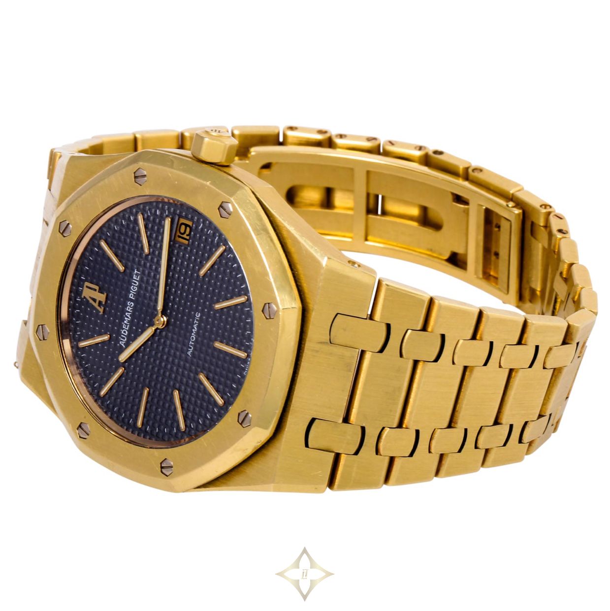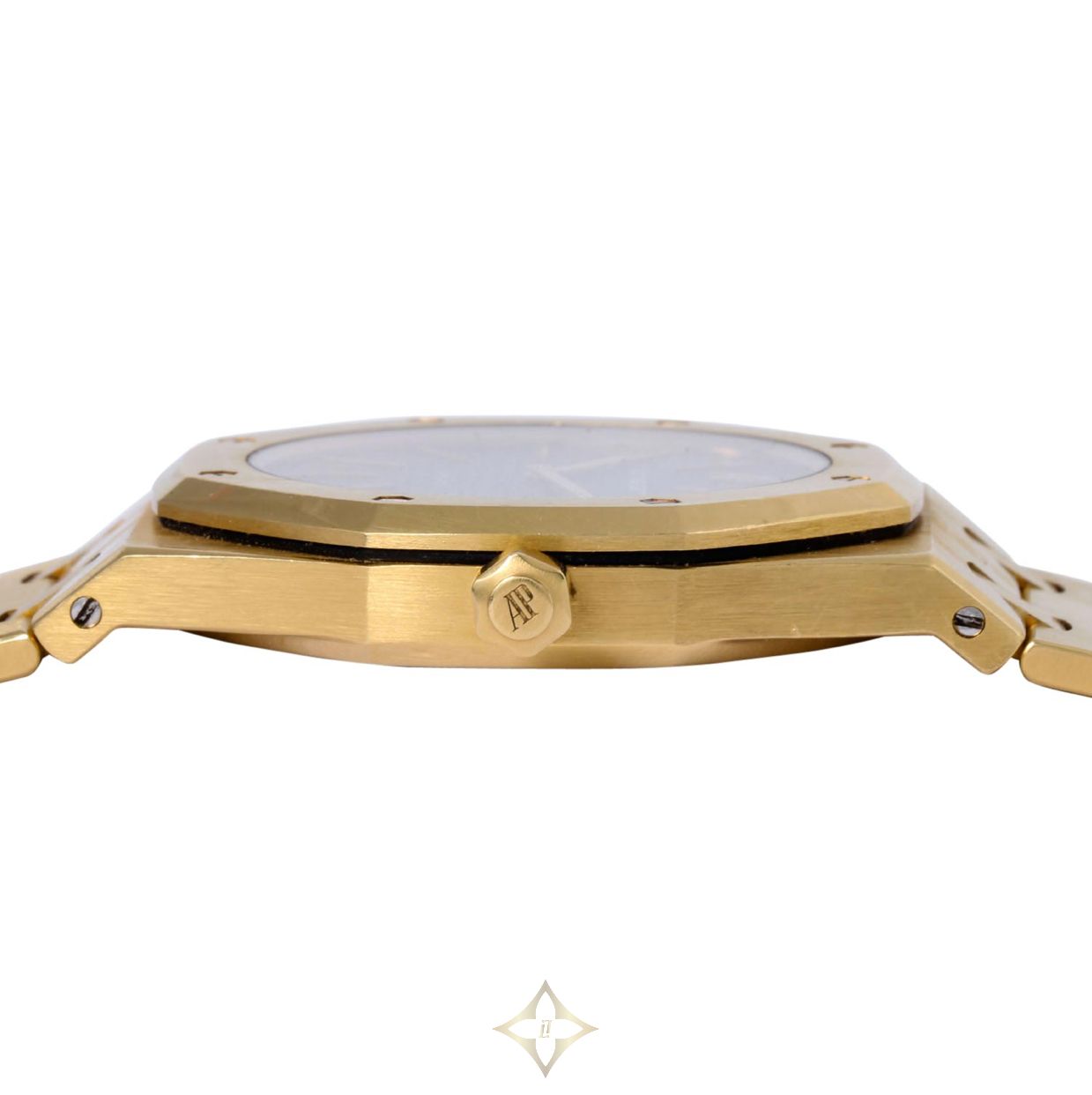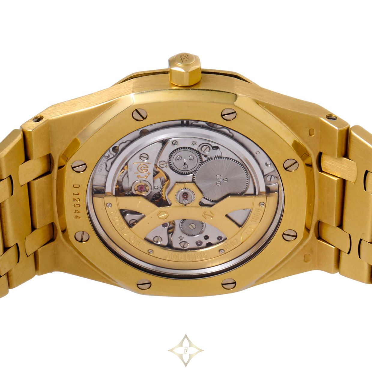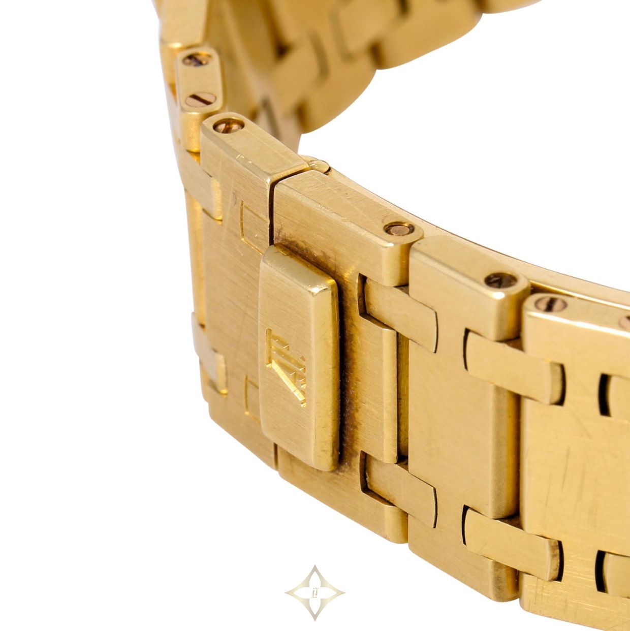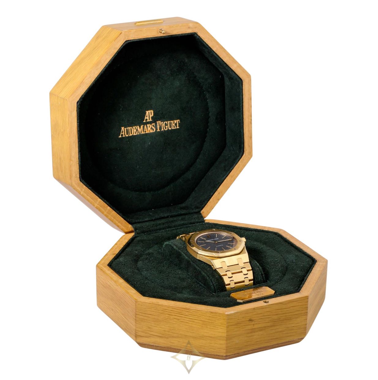 Gelbgold 18K. Automatik-Werk Kal. 2121 mit skelletiertem Rotor (Nr. 0102/1000), funktionsfähig. Seltenes graues Tritium-Zifferblatt mit petite Tapisserie Muster, signiert 'SWISS MADE', Service-Zeiger (Luminova). Limitierte Auflage zum 20-jährigen Jubiläum der Royal Oak 1992, wovon nur 287 der 1000 Exemplare in Gelbgold hergestellt worden sind. Sichtbare Gebrauchsspuren an Gehäuse und Armband. Originale Holzbox mit Limitierungsnummer 102 und Papiere anbei, gekauft 03/1993 bei Andreas Huber in München. Service ca. 2015 (AP-Timepiece Life & Care USB-Karte anbei). Durchmesser ca. 39mm ohne Krone, passend bis zu einem Handgelenksumfang von ca. 19,5cm.