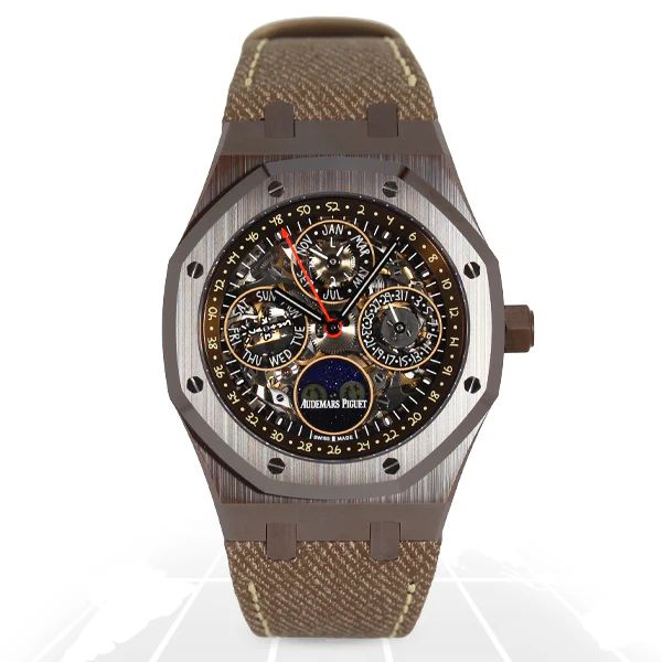 AUDEMARS PIGUET ROYAL OAK PERPETUAL CALENDAR “TRAVIS SCOTT” “CACTUS JACK” 26585CM.OO.D301VE.01 2024 SKU: OW507024 PRICE: £448,895 Description OW REF OW507024 BRAND Audemars Piguet MODEL REF 26585CM.OO.D301VE.01 CONDITION Mint YEAR 2024 MOVEMENT Automatic CASE SIZE 41 DIAL Transparent CASE MATERIAL Ceramic BRACELET MATERIAL Brown Textile WATERPROOF (METERS) <20 m BOX Yes PAPERS Yes FUNCTIONS Date, Day, Month, Moonphase, Perpetual Calendar ——— OFFICIAL WATCHES (VAT Reg No: GB 894 1508 02) STORE LONDON 6 Duke St, London W1U 3EN, United Kingdom Email: sales@officialwatches.com Phone: +44 20 7935 4009