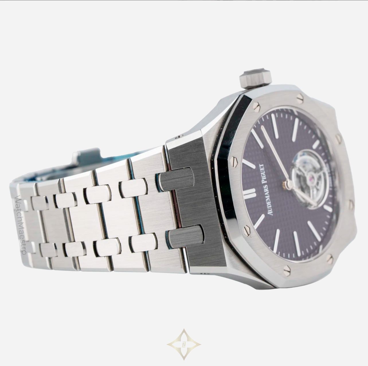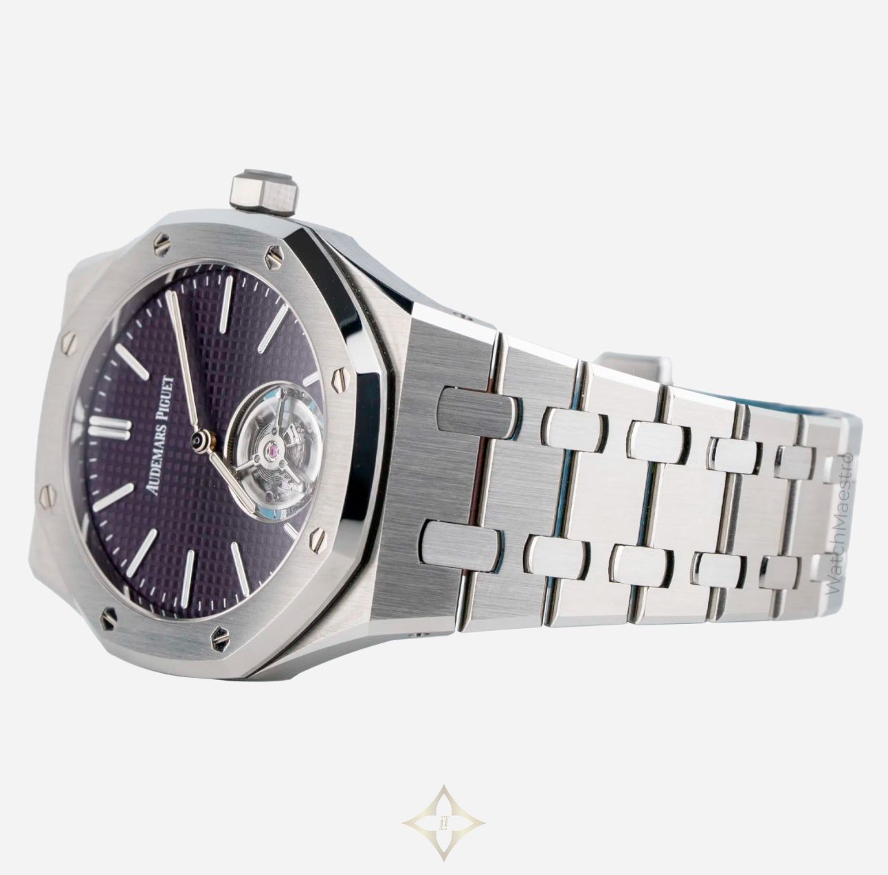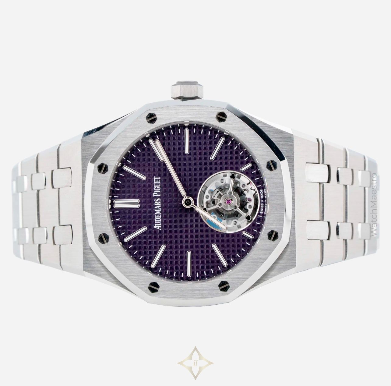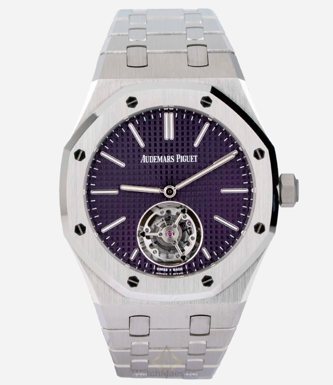 Audemars Piguet Royal Oak Tourbillon 37mm with Purple Dial Reference: 26660ST PRICE: AED 879,900 Price is exclusive of VAT ADDITIONAL INFORMATION Brand: Audemars Piguet Model: Royal Oak Watch Details Reference Number: 26660ST Year Of Production: 2025 Gender: Mens Watch Unisex Condition: Unworn Scope: Watch With Original Box And Papers Case & Dial Case Material: Steel Case Diameter: 37mm Dial Color: Purple Dial Numerals: No Numerals Bezel Material: Steel Bracelet Details Bracelet Material: Steel Band Color: N/A Function Movement: Automatic DESCRIPTION If you like Tourbillon, you are going to love this one! This Audemars Piguet Royal Oak Tourbillon in 37mm features a striking purple dial offering a perfect blend of bold design and exceptional craftsmanship. The signature Tapisserie dial in deep purple immediately draws attention, while the exposed tourbillon at 6 o’clock enhances the look of the watch. Crafted in stainless steel, reference 26660ST retains the iconic Royal Oak aesthetic with a refined case size that wears beautifully on the wrist. Purchased in 2025, this unworn timepiece comes complete with box and papers. The 37mm Tourbillon isn’t just rare due to its size, but it also features a Tourbillon complication, which is not easy to fit into a small watch like this one. Whether admired for its vibrant color or its mechanical brilliance, this watch stands as one of the most exclusive modern offerings from Audemars Piguet. ——— WatchMaestro Shop No. 5, Ground Floor - Lobby Area, Concord Tower, Dubai Media City Al Sufouh - 2 - Jumeirah - Dubai - United Arab Emirates Phone: +971 58 225 7400 Email: info@watchmaestro.com