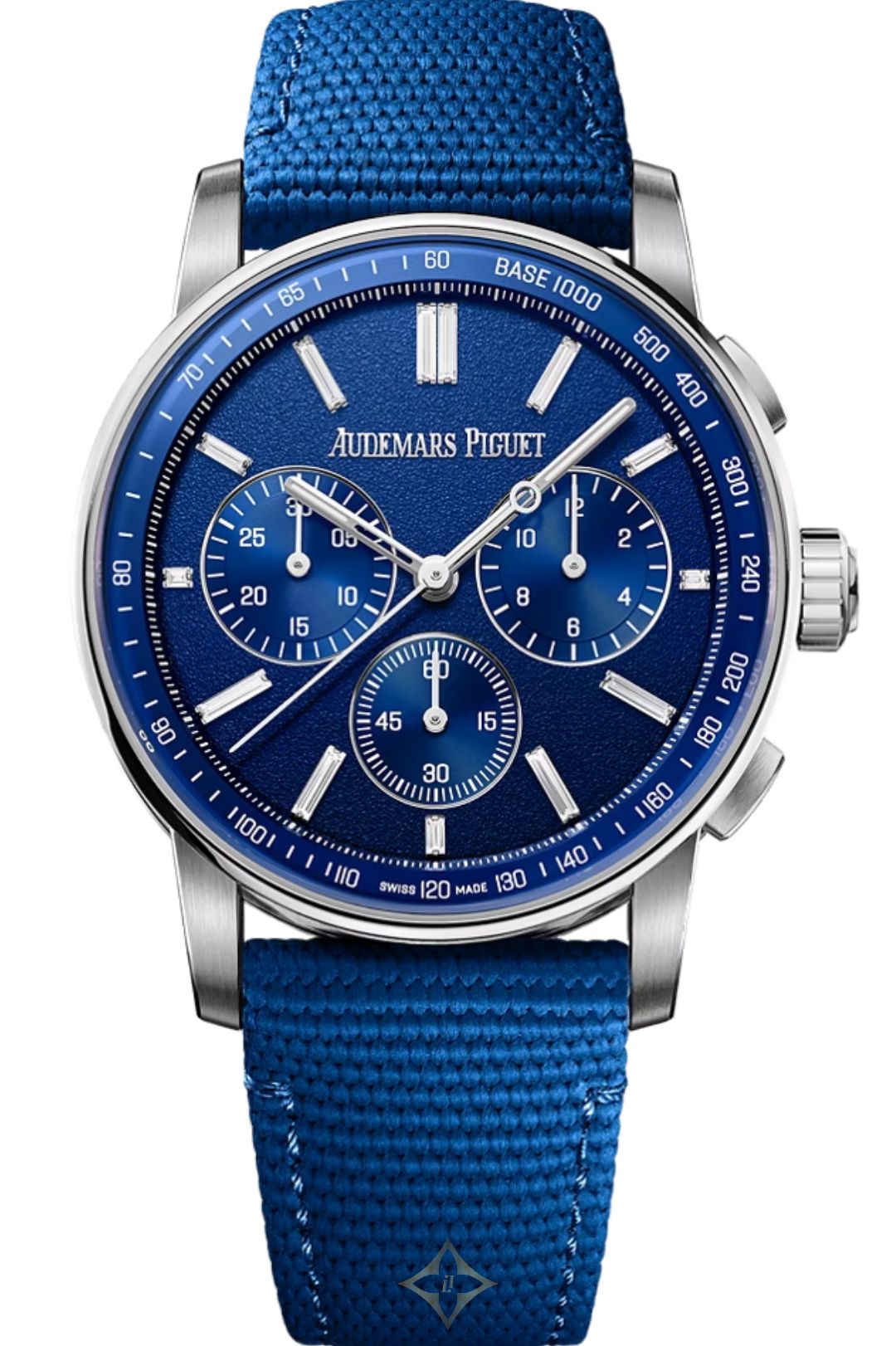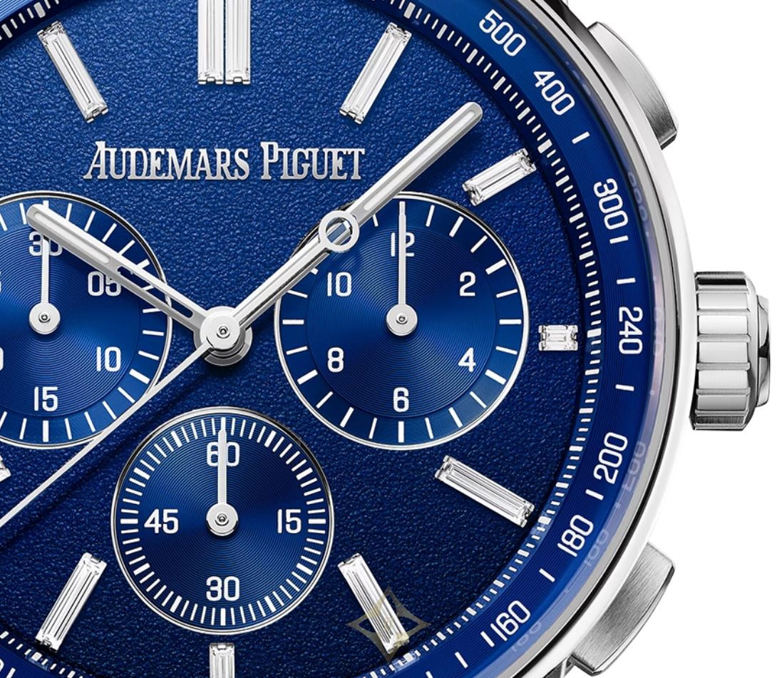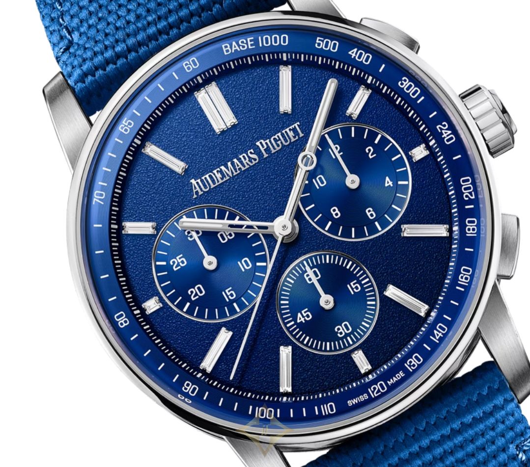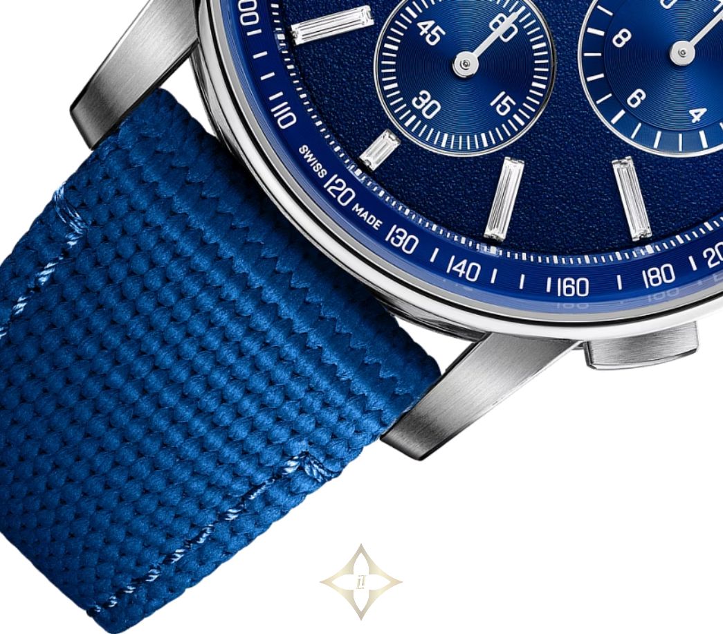 The Tuscany Blue grained dial combines a blue inner bezel and azured blue counters with 18-carat white gold luminescent hands and matching hour-markers set with baguette-cut diamonds.