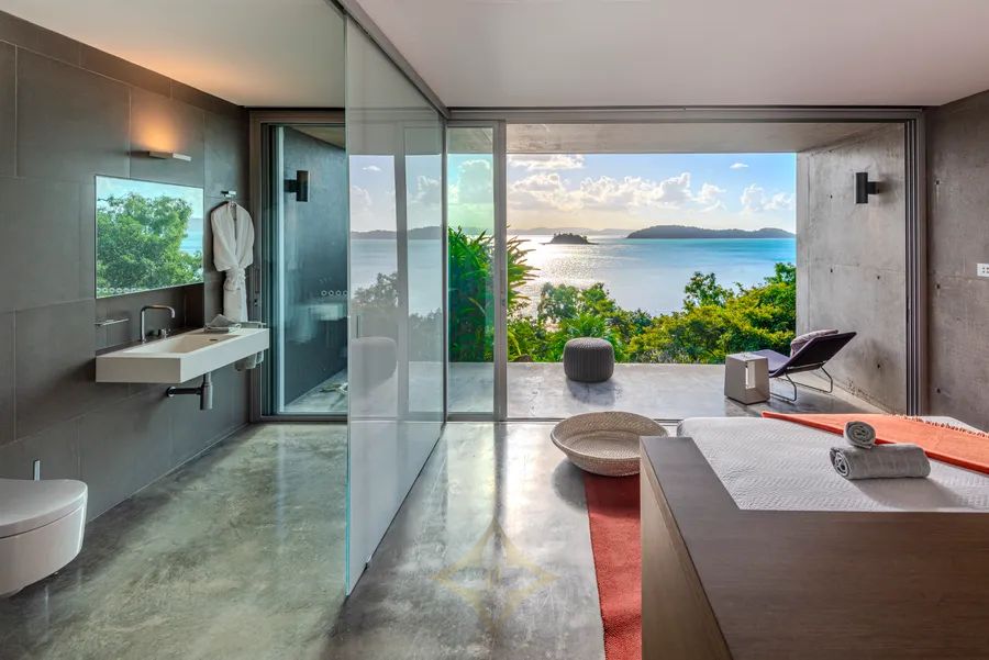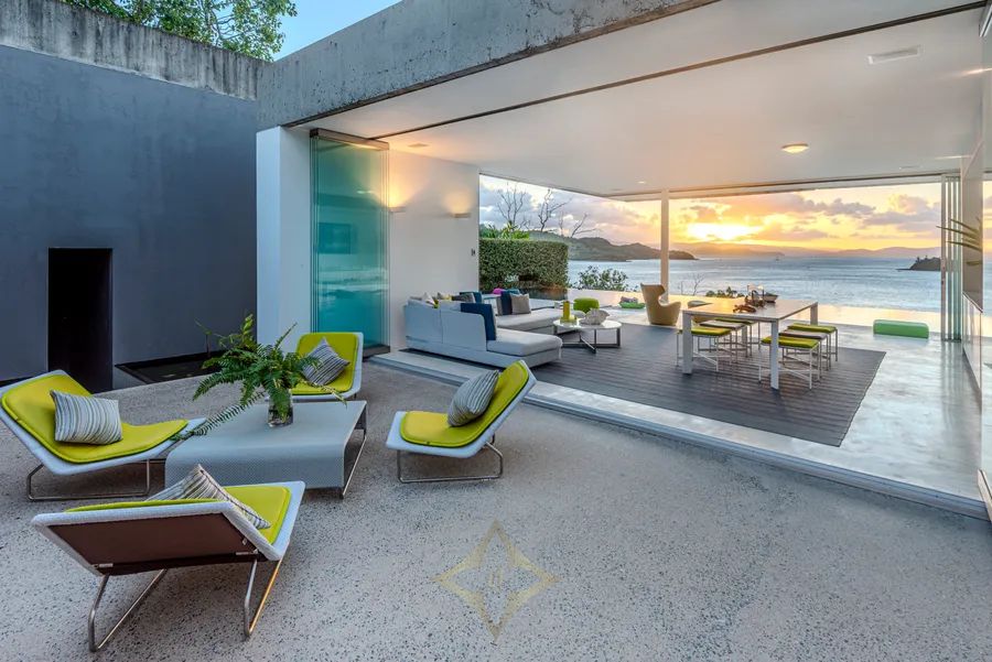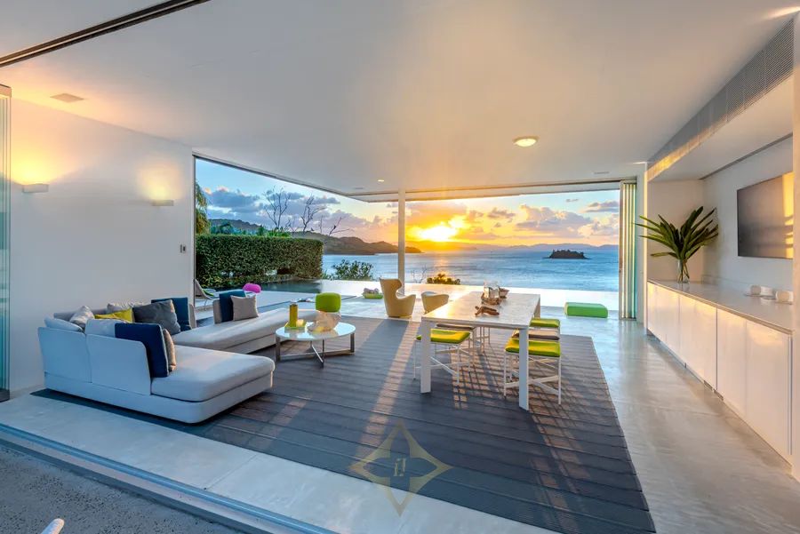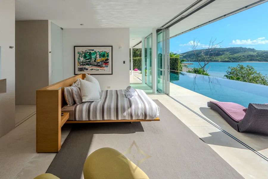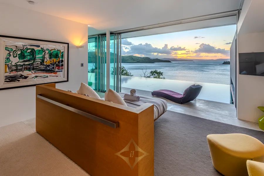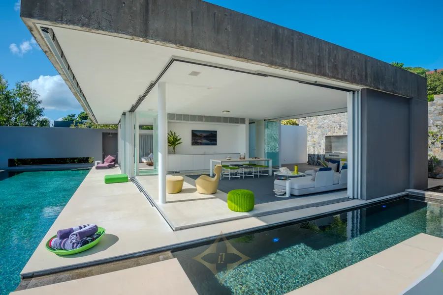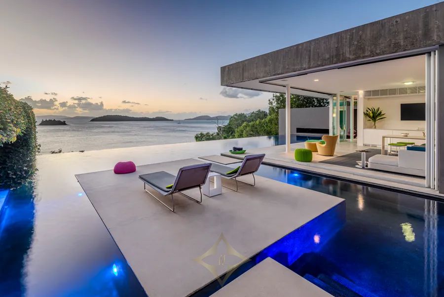 The award-winning design, with floor-to-ceiling disappearing glass sliding doors, allows for a seamless connection to the glistening, sundrenched island waters providing casual, elegant, indoor/outdoor living in perfect harmony with the natural beauty and serenity. Every level and every vantage point provide enormous surprise and delight. Corners of the home float above the landscaped garden terraces and nooks set into the hillside, featuring natural stone, allowing the environment to dominate giving a sense of flowing tranquillity and sensuous tactility to ”Azuris”.