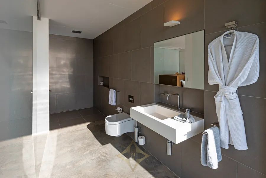 Wrapping the entirety of the rear exterior of the home, the infinity pool stretches to a central tanning deck with two floating walkways leading from the living area. This main living area with the open plan kitchen is positioned on the upper level as is, the master bedroom suite with an adjoining bathroom and dressing room also opening to the pool. ”Bold in size and elevation, the pool blends visually with the sea, enabling one to swim above the sea in total privacy,” a quote from the architect’s office.