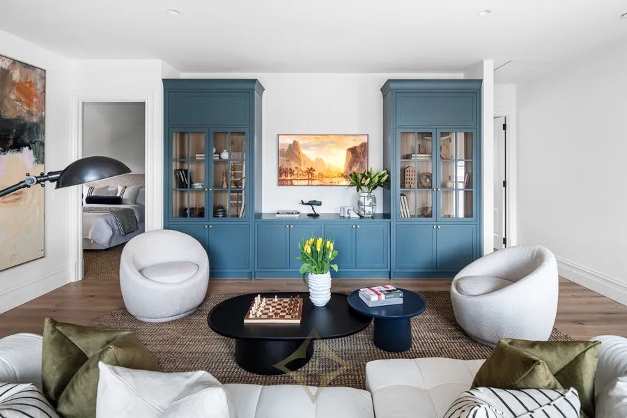The interiors read as an extension of the facade’s intentionally aged composition, creating a series of individually styled spaces that unify with the 5-bedroom, 3-living area residence’s foremost design brief, delivering a distinguished interior of Oak floors, Ralph Lauren chandeliers and substantial double-glazed Georgian windows, illuminating subtle marble elements and artful craftsmanship while framing its beautiful grounds and bay views beyond.