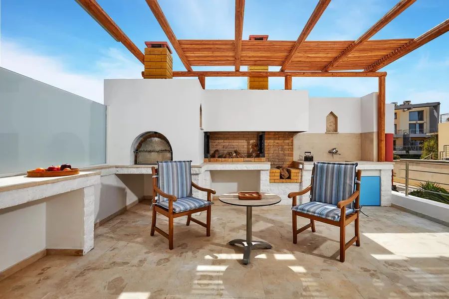 At the main entrance there is a large veranda with two benches. All balconies and verandas have lounge furniture with either pergolas or umbrellas so as to enjoy every spot of the outside areas.