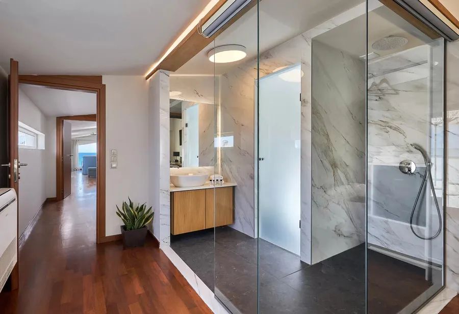 In the Attic there are two more Ensuite Master bedrooms, One in the North side that has amazing views to the sea and the sandy beach, with unobstacled sunset scenery and a balcony with a jacuzzi. The other on the South side also has its own balcony with a jacuzzi and views both to mountain & sea.