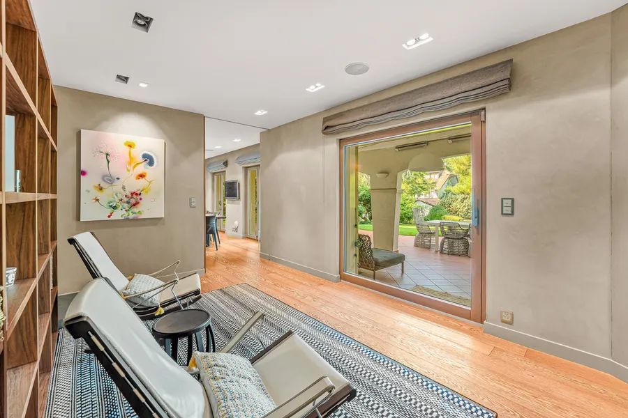 The living area opens onto the garden and consists of an office, a spacious living room with fireplace, a library area and a spacious kitchen open to the dining room.