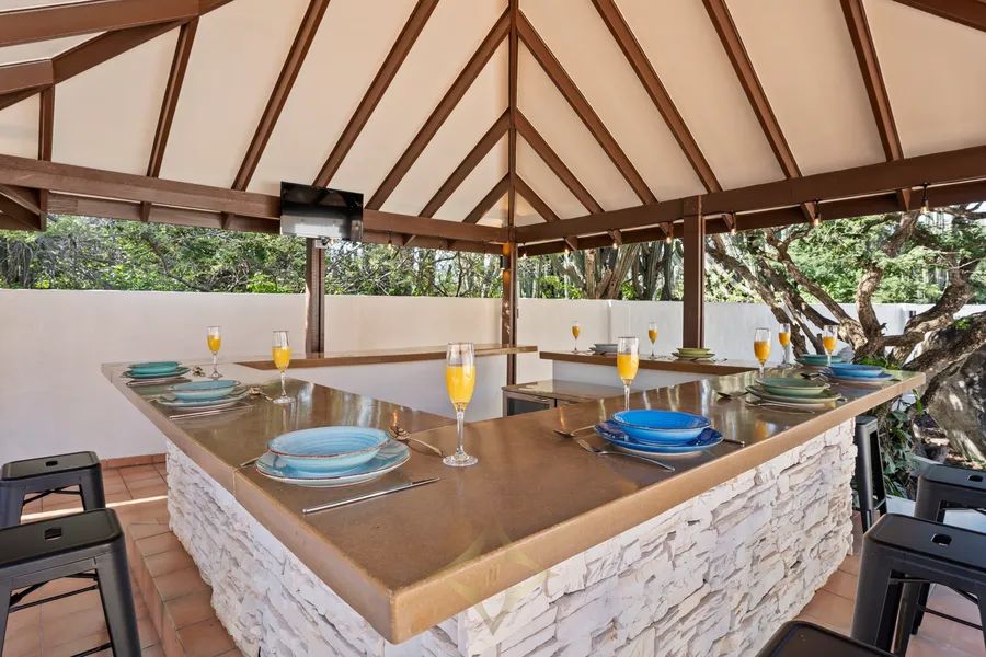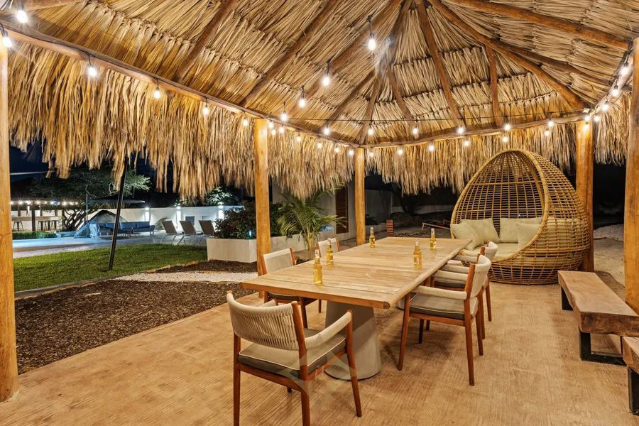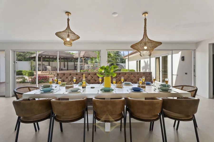 At the heart of the villa is a spacious, fully equipped kitchen with premium appliances including two refrigerators, two freezers, a Quooker and ample workspace. The kitchen flows directly into a large indoor dining area with a substantial family-style table, which is perfect for shared meals and casual connection. Dining can also be enjoyed outdoors under a shaded palapa surrounded by lush landscaping.