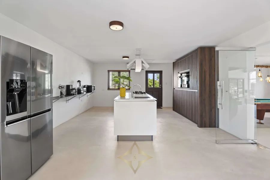 The outdoor space has been thoughtfully designed to offer both relaxation and recreation in a private, tropical setting. Enjoy a refreshing dip in the swimming pool, or unwind in the shaded lounge areas and hammocks. The beach-style sand area features a volleyball court and outdoor games, while a dedicated yoga space invites moments of calm and mindfulness. An outdoor bar with cooler, BBQ area provide a perfect setting for entertaining or enjoying Aruba’s tropical climate. Additional practical features include a laundry room with washer and dryer, an outdoor half bathroom and ample storage space, making everyday living convenient and easy.
