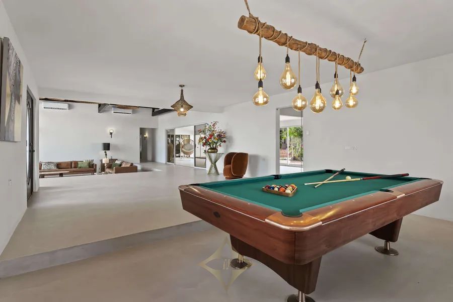 An open-concept living area benefits from natural light streaming through a striking glass façade, creating a bright and airy ambiance. Additional features such as a pool table and arcade game add a touch of character and enjoyment to the home. Every space is air-conditioned and finished to a high standard.