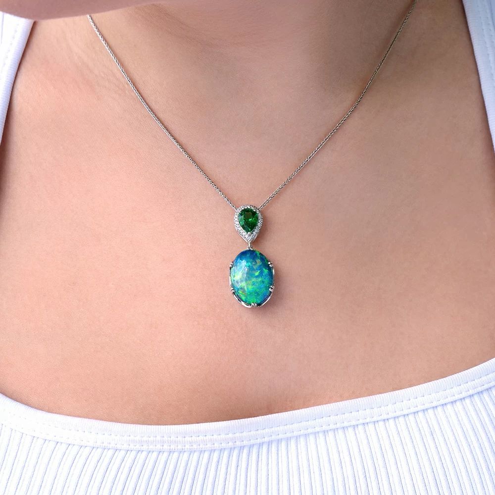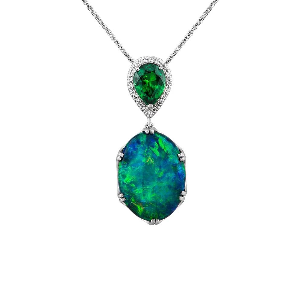 Black Opal and Tsavorite Garnet Pendant STYLE NO: 132999 This magnificent platinum Wixon Custom features an 11.44-carat oval Australian black opal, which is paired with a 1.65-carat pear shaped Tsavorite garnet and framed by glistening round brilliant diamonds. The striking color of the Tsavorite garnet draws out the greens in the coveted broadflash pattern of the opal, creating the perfect complement to this rare and spectacular gemstone. PRICE: $49,000 Originally $94,900 ——— WIXON JEWELERS