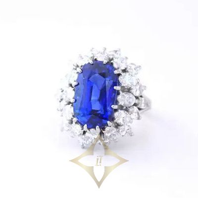 A stunning vintage Boucheron sapphire ring. This beautiful ring showcases a certified natural non-heated Royal Blue Burma sapphire of 7.70 carats which is a very fine crystal with no visible inclusions, surrounded by marquise-cut diamonds. Circa 1960’s.
