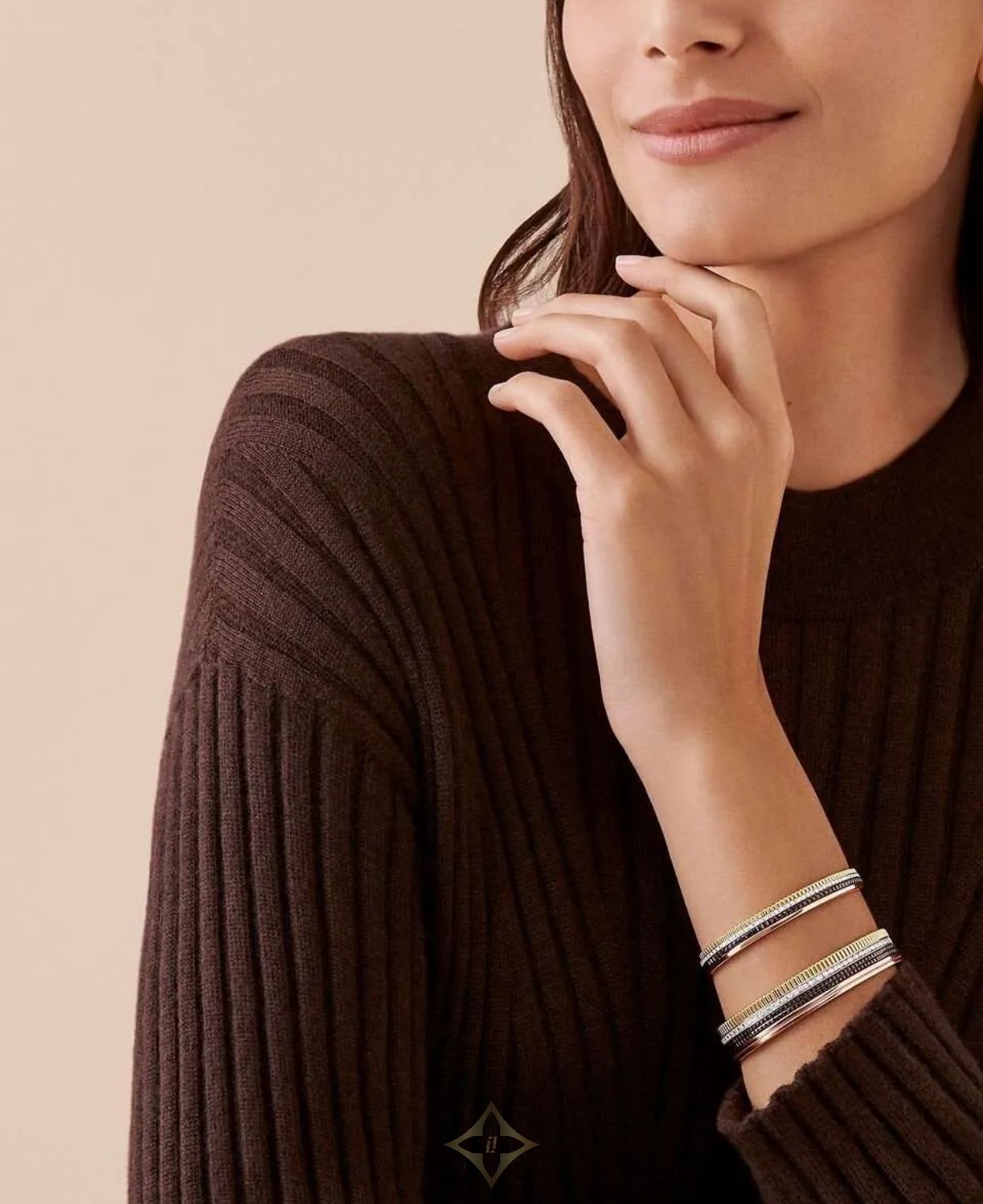 This 18kt Quatre Classique cuff bracelet multiplies the features of the iconic Quatre ring with its graphic architecture. Grosgrain in yellow gold, Double Godron in pink gold, Clou-de-Paris in gold and brown PVD, and a line of 134 sparkling diamonds (7.93 crts). You will certainly make a statement with this cuff.