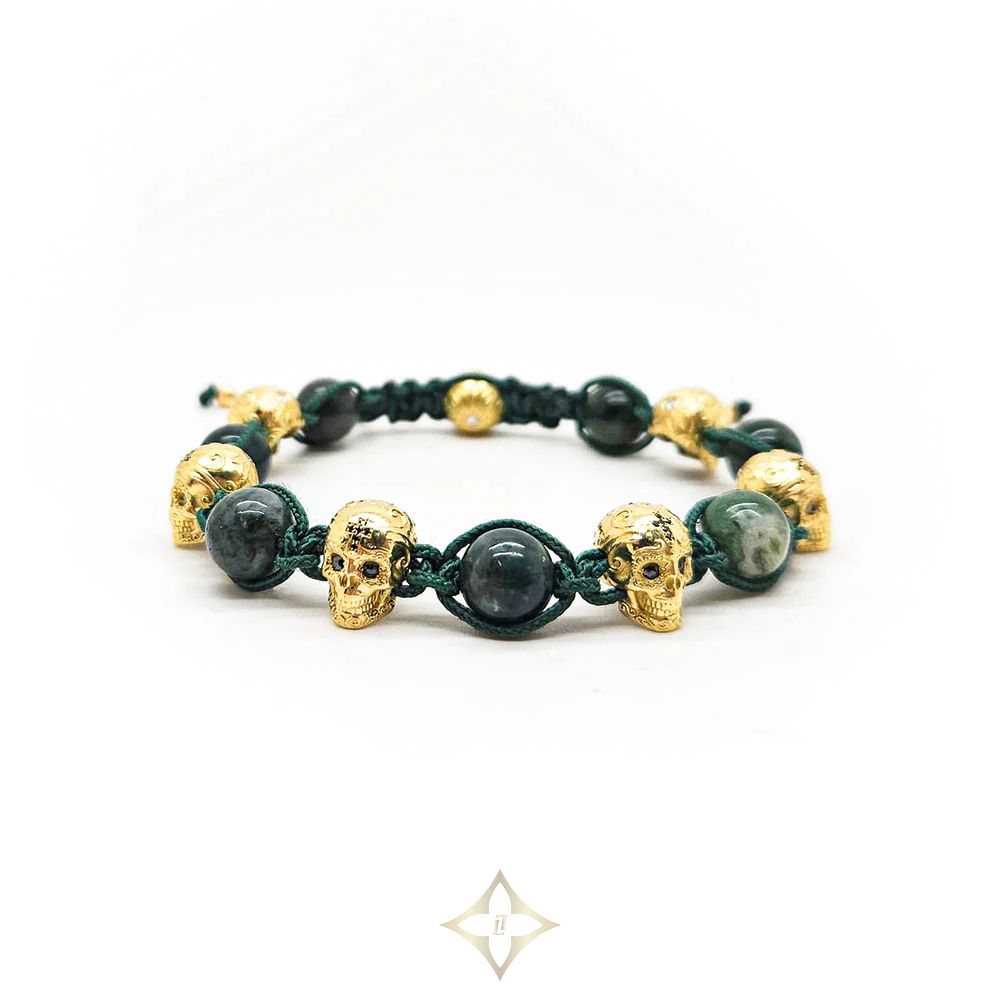 Detailed skulls in CALAVERA design combined with black diamonds and moss agate stones.