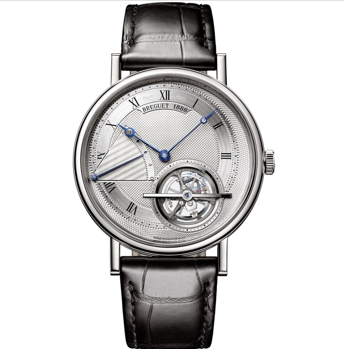 Dial Features Roman Numeral Hour Markers, Blued Hands, Power Reserve Indicator, Small Seconds on Tourbillon Cage, Tourbillon Cage