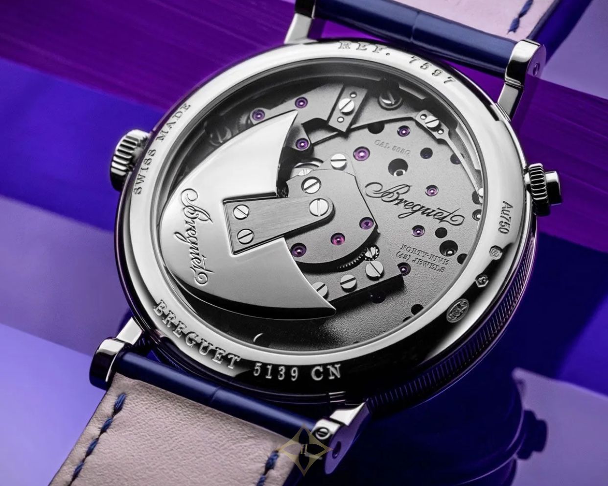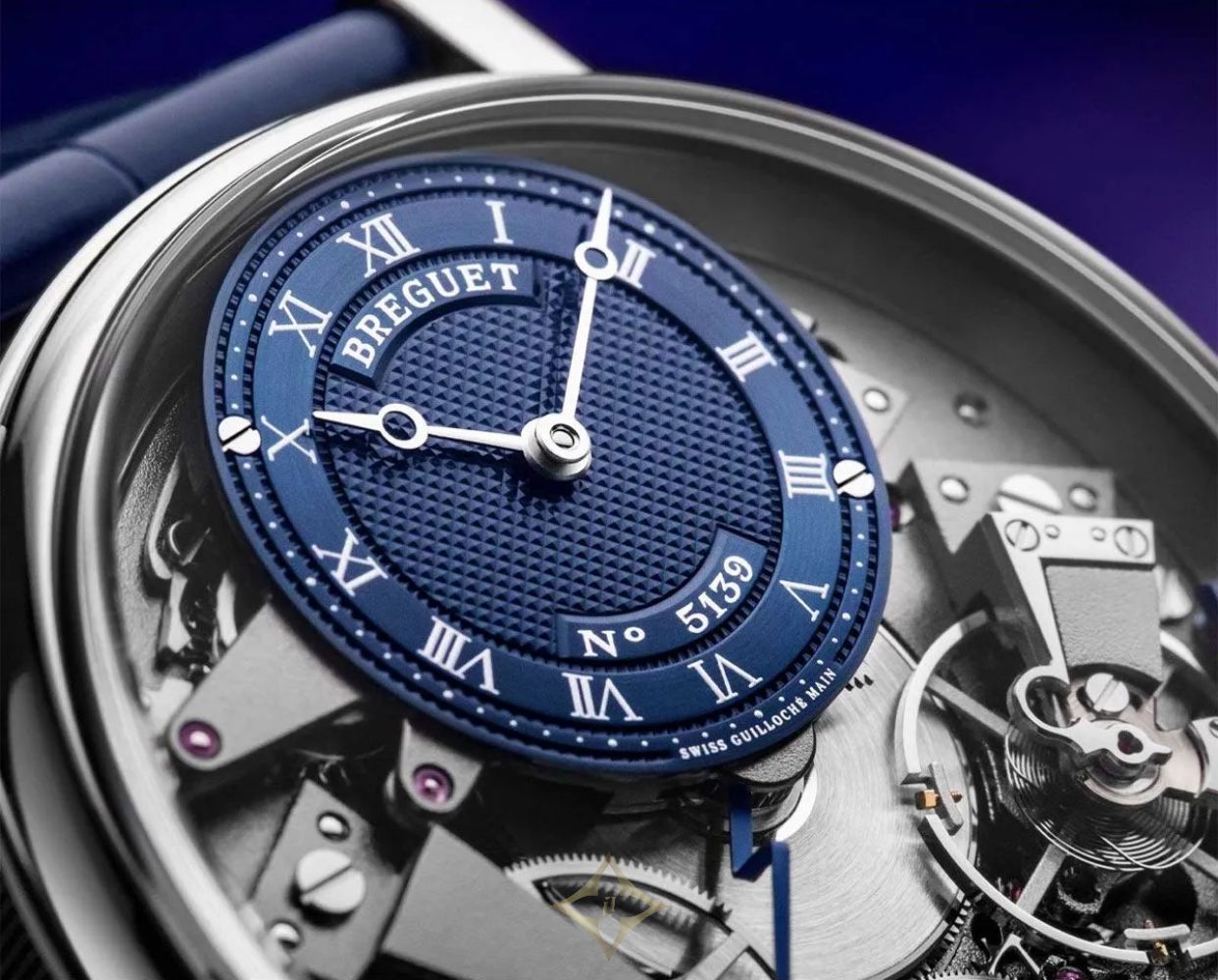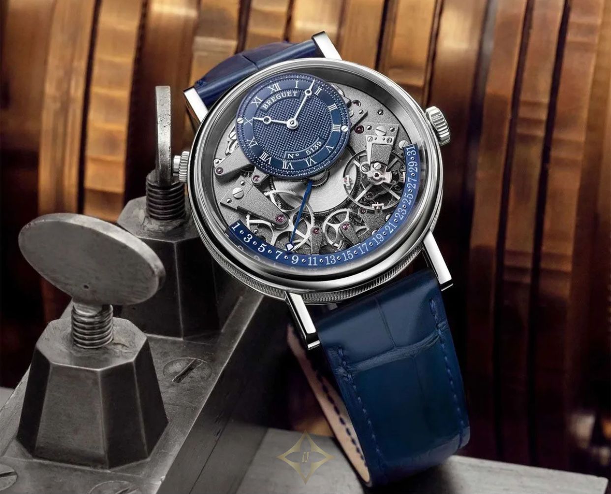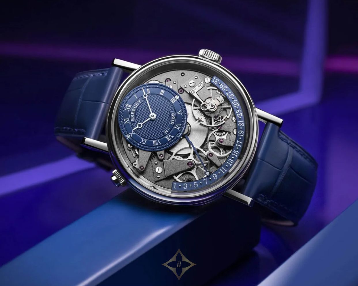 With a power reserve of approximately 50 hours, the Breguet Tradition Quantième Rétrograde ensures reliable timekeeping. The watch is designed with a sapphire caseback, allowing a view of its intricate workings. Water-resistant to 30 meters, it combines practicality with luxury, making it suitable for various occasions. The blue leather strap complements the dial, enhancing the watch's overall aesthetic and ensuring a comfortable fit.