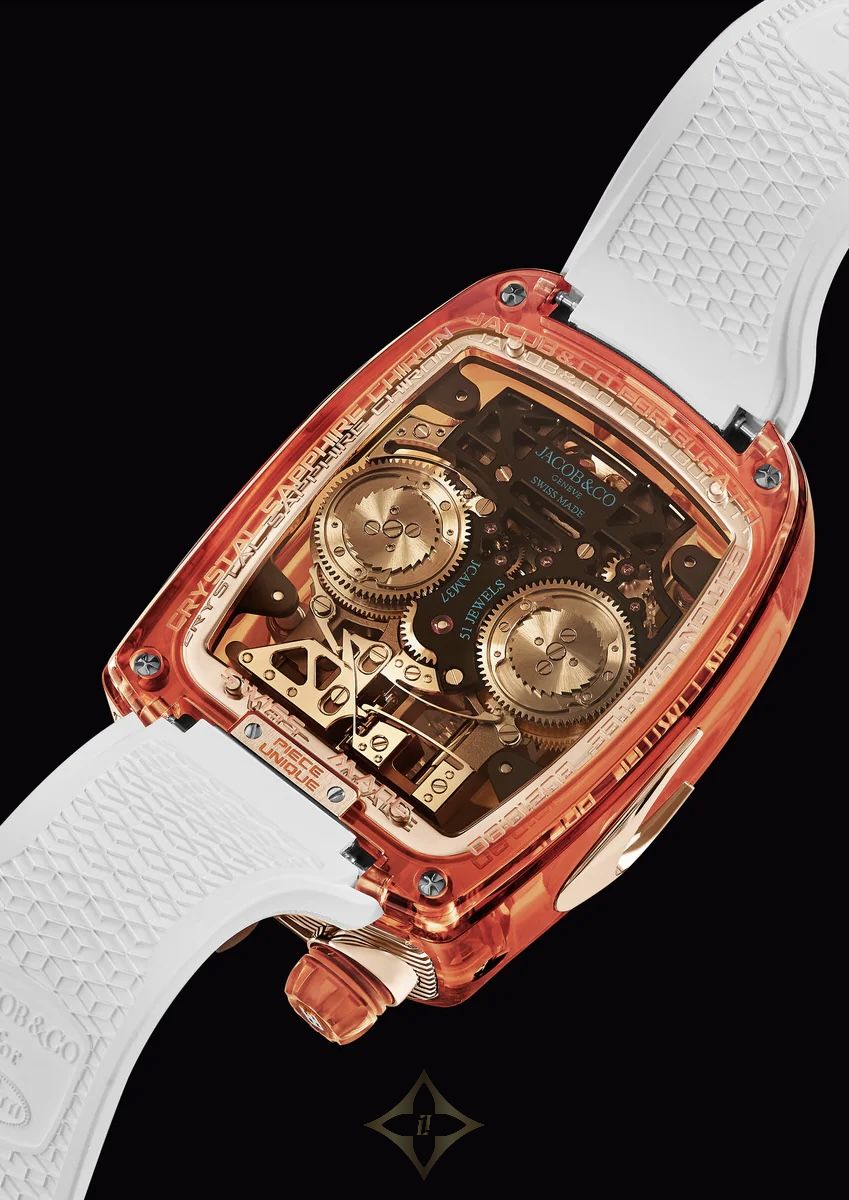 Bugatti Chiron Tourbillon Sapphire Crystal | Orange Sapphire Crystal Jacob & Co. Regular price: $1,650,000.00 I.ITEM NUMBER BU210.80.AE.UA.B II.MOVEMENT Caliber: JCAM37 Winding : Hand-wound Components: 578 Power Reserve: 60 Hours Frequency: 21'600 vph (3 Hz) Functions: Hours, Minutes One-minute Flying Tourbillon with 30° Incline W16 Engine-block Automaton Power Reserve Indicator at 9 o'clock III.CASE Size: 57.8x44.4 mm Height: 21.5 mm Material: Orange Sapphire Crystal with Anti-Reflective Coating and 18K Rose Gold Crystal: Anti-Reflective Orange Sapphire Crystal Caseback: Orange Sapphire Crystal and Titanium Crowns and Pusher: Orange Sapphire Crystal Water resistance: 30 m (3 atm) IIII.DIAL & HANDS Rose Gold-plated Dial with Orange Indices and Orange "EB" Logo Rose Gold-plated Skeleton Hands with Orange and Luminescent Tips V.STRAP & CLASP Strap: Translucent Rubber Clasp: 18K Rose Gold Deployant Clasp ——— Maddaloni Jewelers Store Address: 1870 E Jericho Tpke, Huntington, NY, United States, New York Phone: +1 631-499-8800 Email: info@maddalonijewelers.com