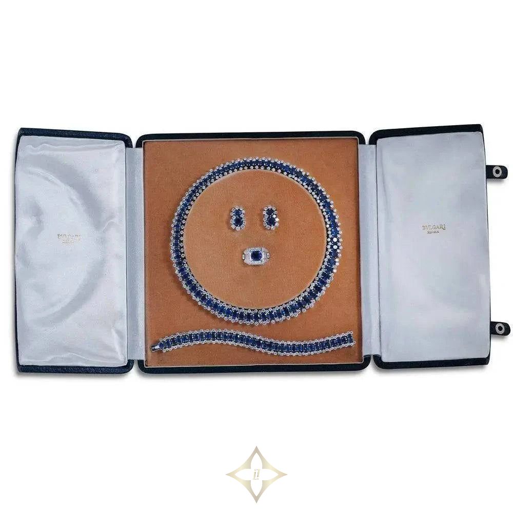 Today, Bvlgari remains synonymous with Italian luxury, crafting not only jewelry but also watches, fragrances, and leather goods. As part of the prestigious LVMH Group, Bvlgari continues to uphold its legacy of exceptional craftsmanship and design, making this sapphire and diamond suite a true collector’s piece, enhanced by its presentation in the original fitted Bvlgari box.