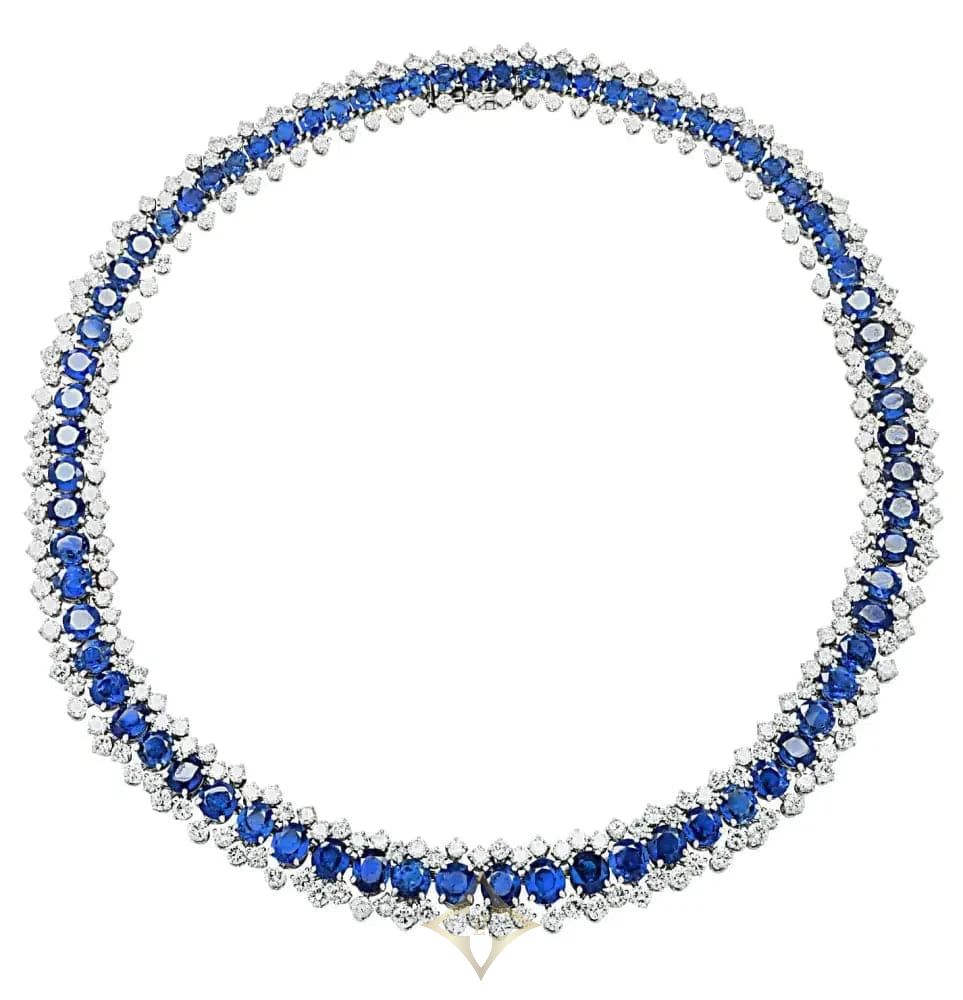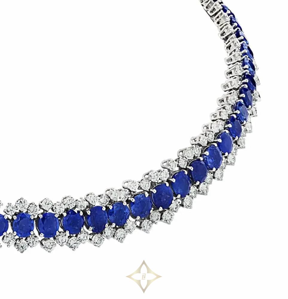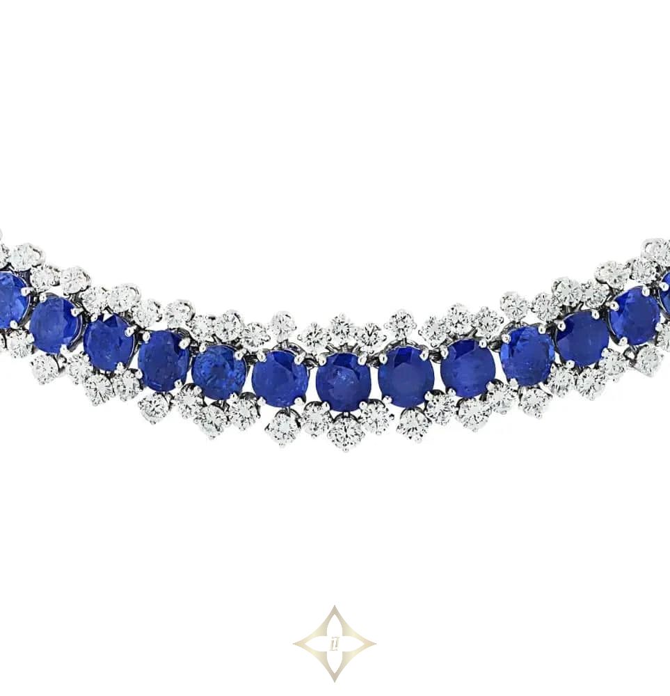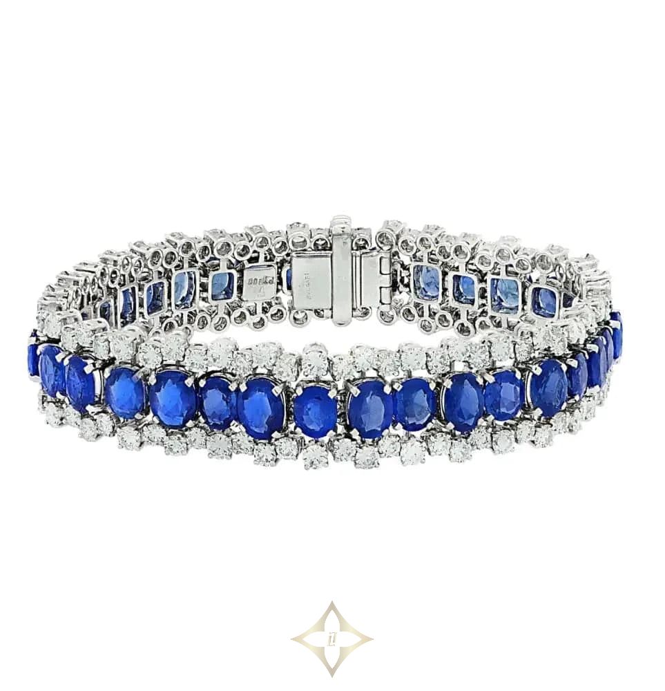 A stunning complement to the necklace, the bracelet embraces the wrist with No Heat Burma Sapphires weighing approximately 20 carats total, while diamonds totaling 7.5 carats create a luminous surround. Measuring 6 inches in length and 0.5 inches in width, the bracelet delivers a sense of both opulence and subtle refinement, making it as comfortable as it is beautiful.