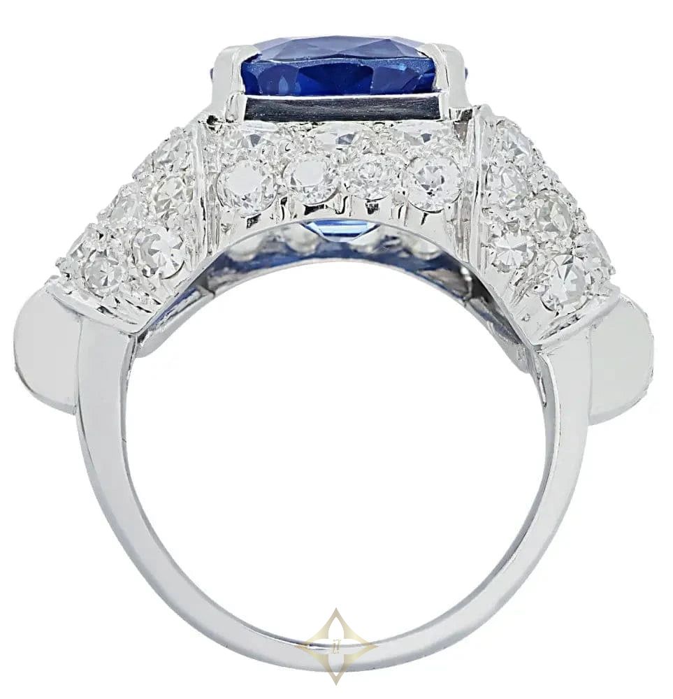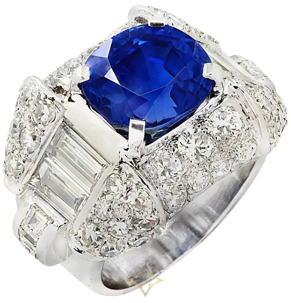 This exquisite ring showcases a 5.50 carat No Heat Burma Sapphire at its center, enhanced by approximately 4 carats of diamonds. With a face measuring 0.6 inches in width and a size of 3.5, the ring offers a perfect balance between size and sophistication. Its design exemplifies the artistry of Bvlgari’s ability to craft rings that feel substantial yet graceful.
