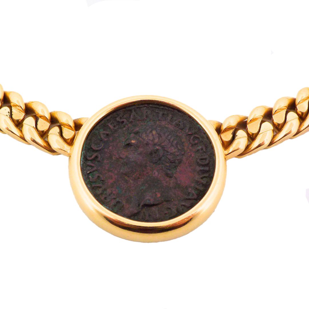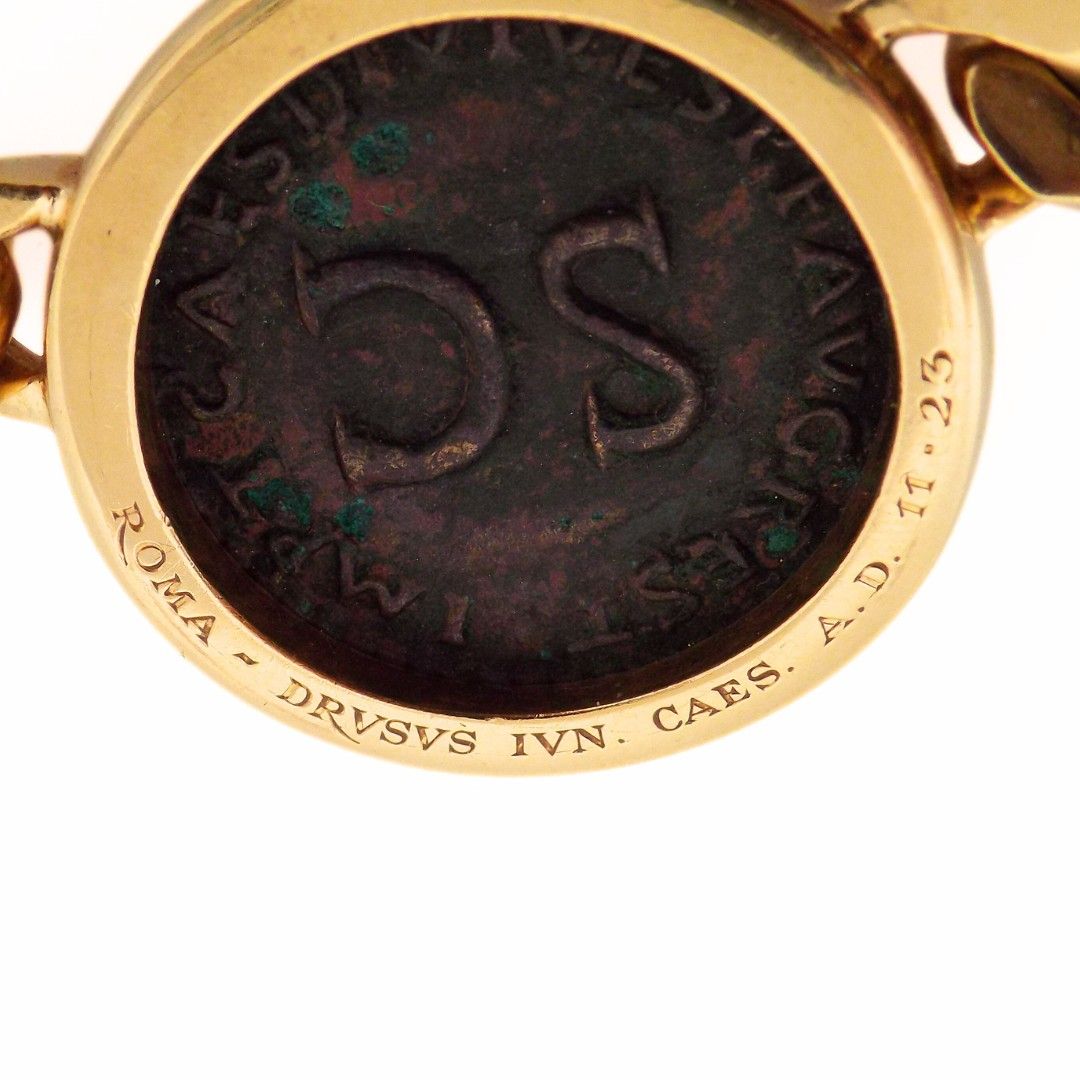 Of iconic Monete collection, featuring an ancient roman coin set in gold bezel engraved "ROMA - DRVSVS IVN. CAES. A.D. 11 - 23.", connected by a curb link chain.