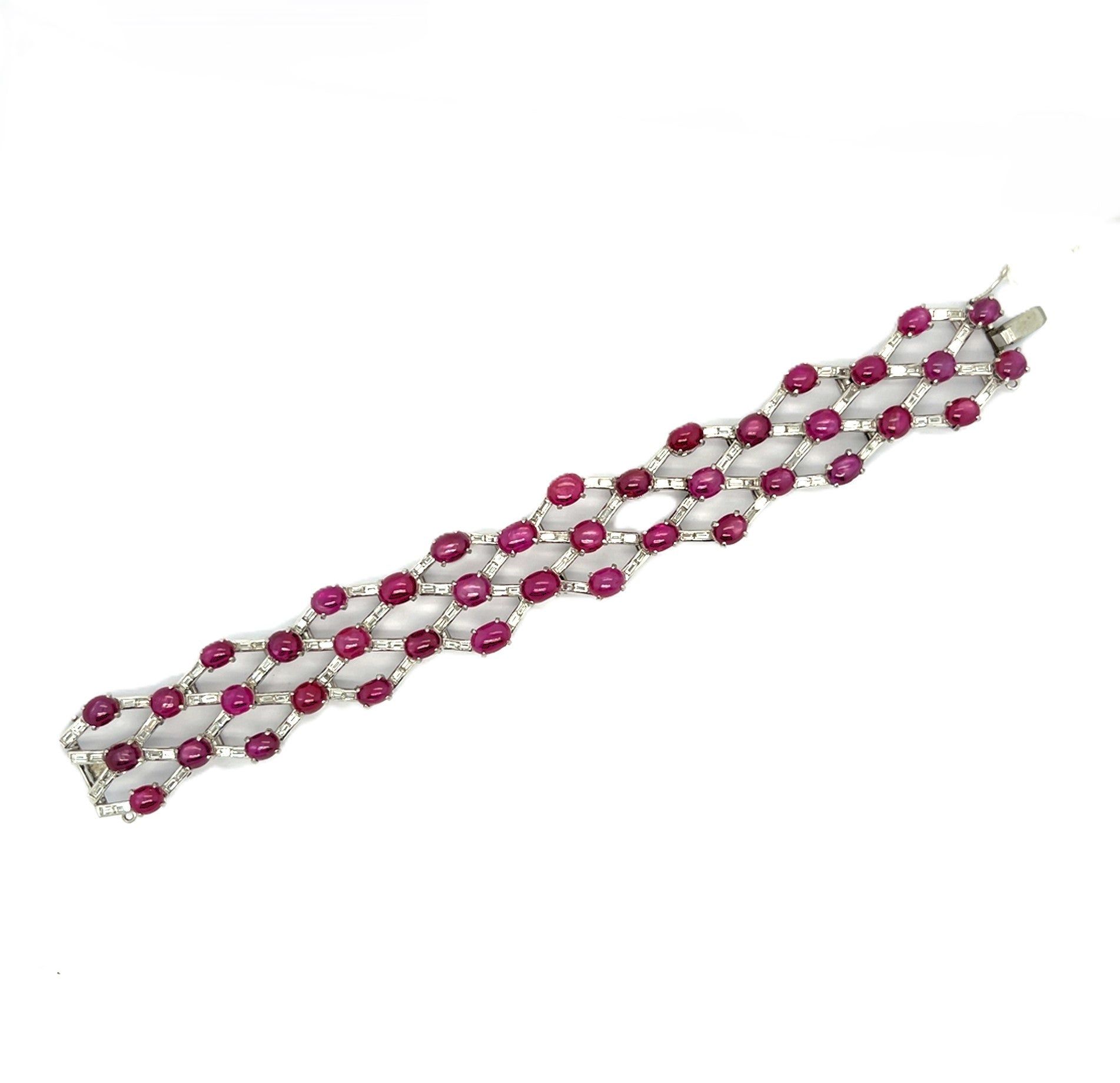This captivating bracelet showcases a delicate lattice of cabochon rubies and baguette-cut diamonds, elegantly set in white gold. The fluid, openwork design enhances the rubies’ vibrancy, creating a seamless blend of color, brilliance, and timeless sophistication.