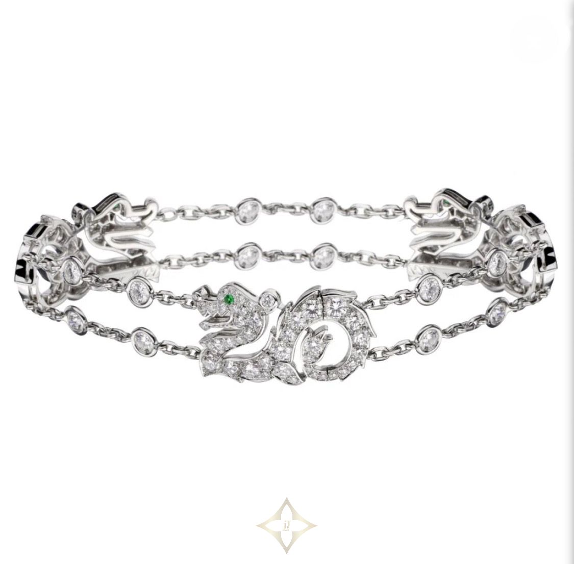 CARTIER ICONIC "THREE DRAGON" DIAMOND BRACELET IN 18KT WHITE GOLD Ladies iconic Cartier bracelet featuring 3 dragons in 18kt white gold. This bracelet features 3 dragons set with green emerald eyes.It is joined by a double row cable link chain. This bracelet features approximately 5.30 total carat weight of Brilliant cut diamonds .Length of bracelet:7 inches. (W) 15mm.Circa 2001. Made in France. Excellent condition. Brand:Cartier Accompanied by the original Cartier box and papers. SKU: 23983 j PRICE: $48,900.00 CAD IN STOCK Description Age Modern Brand Cartier Material 18kt White Gold ——— Van Rijk 90 Eglinton Ave E, Toronto, ON M4P 2Y3, Canada