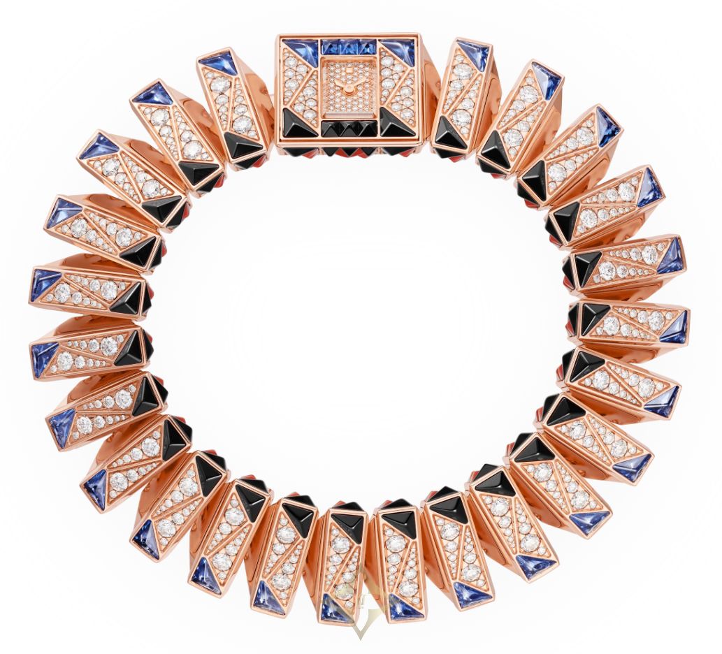 Cartier Libre Rose Gold & Diamonds & Sapphires & Coral & Chrysoprases & Spinels Lady's Watch, HPI01532 Our Price: 6.834.320.000₫ Retail Price: 7.766.273.000₫ Model No: HPI01532 HPI01532 Cartier Libre The Cartier Libre HPI01532 watch is a luxurious and extravagant timepiece that features a large 99.95 x 84.75 mm rhodiumized rose gold case. The watch case is adorned with 735 brilliant-cut diamonds totaling 12.28 carats, 56 pyramid-cut sapphires, 52 pyramid-cut corals, 52 pyramid-cut chyrsoprases, and 84 black pyramid-cut spinels, giving it a striking and unique appearance. The reversible strap of the watch is also embellished with diamonds and features a combination of black and gold tones. The watch has a gold dial with rose gold-toned steel sword-shaped hands, adding to its opulent aesthetic. The watch is powered by a quartz movement and has a solid case back. The front side of the watch is protected by sapphire crystal. The watch is water-resistant up to 30 meters, making it suitable for everyday wear. The Cartier Libre HPI01532 watch performs the basic functions of displaying hours and minutes, and its case thickness is 20.32 mm. Overall, this watch is a statement piece that combines exceptional craftsmanship with a bold and unique design. HPI01532 Cartier Libre Rose Gold & Diamonds & Sapphires & Coral & Chrysoprases & Spinels Lady's Watch. Band material: Diamonds|Rose gold Case back: Solid Case shape: Unique Collection of brand: Libre Google condition: new Google gender: female Watches case material: Diamonds|Rose Gold Watches movement: Quartz Watch brand: Cartier Watch condition: New Watch dial color: Gold Watch gender: Lady Water resistance: 30 meters / 99 feet WORLD OF LUXURY World of Luxury, Inc. SHOWROOM 3363 NE 163 street, Suite 611, North Miami Beach, FL, 33160 Phone: +1 (833) 443-8496 Email: info@worldofluxuryus.com