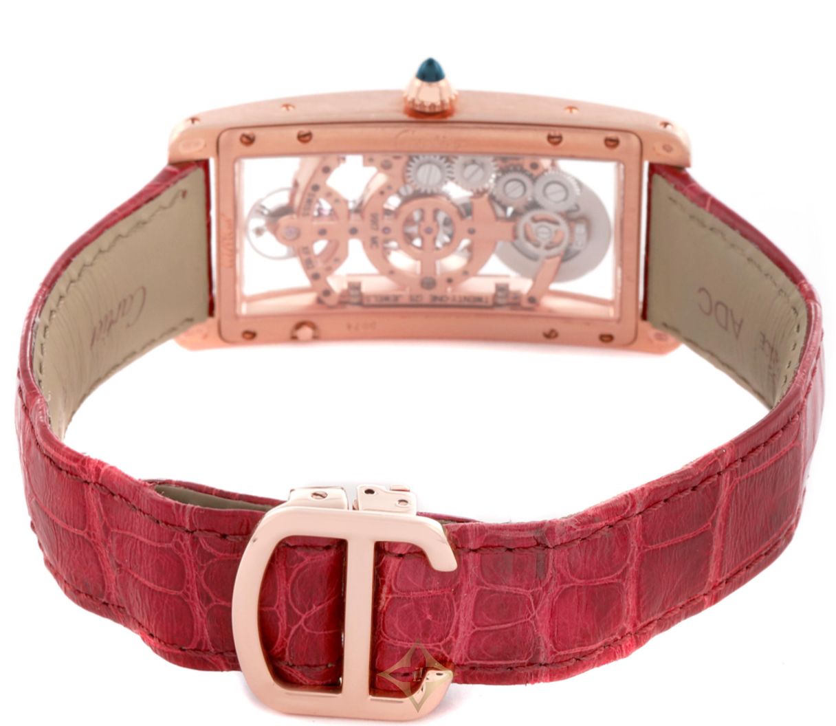 Bracelet: Red leather strap with an 18k rose gold deployant clasp.