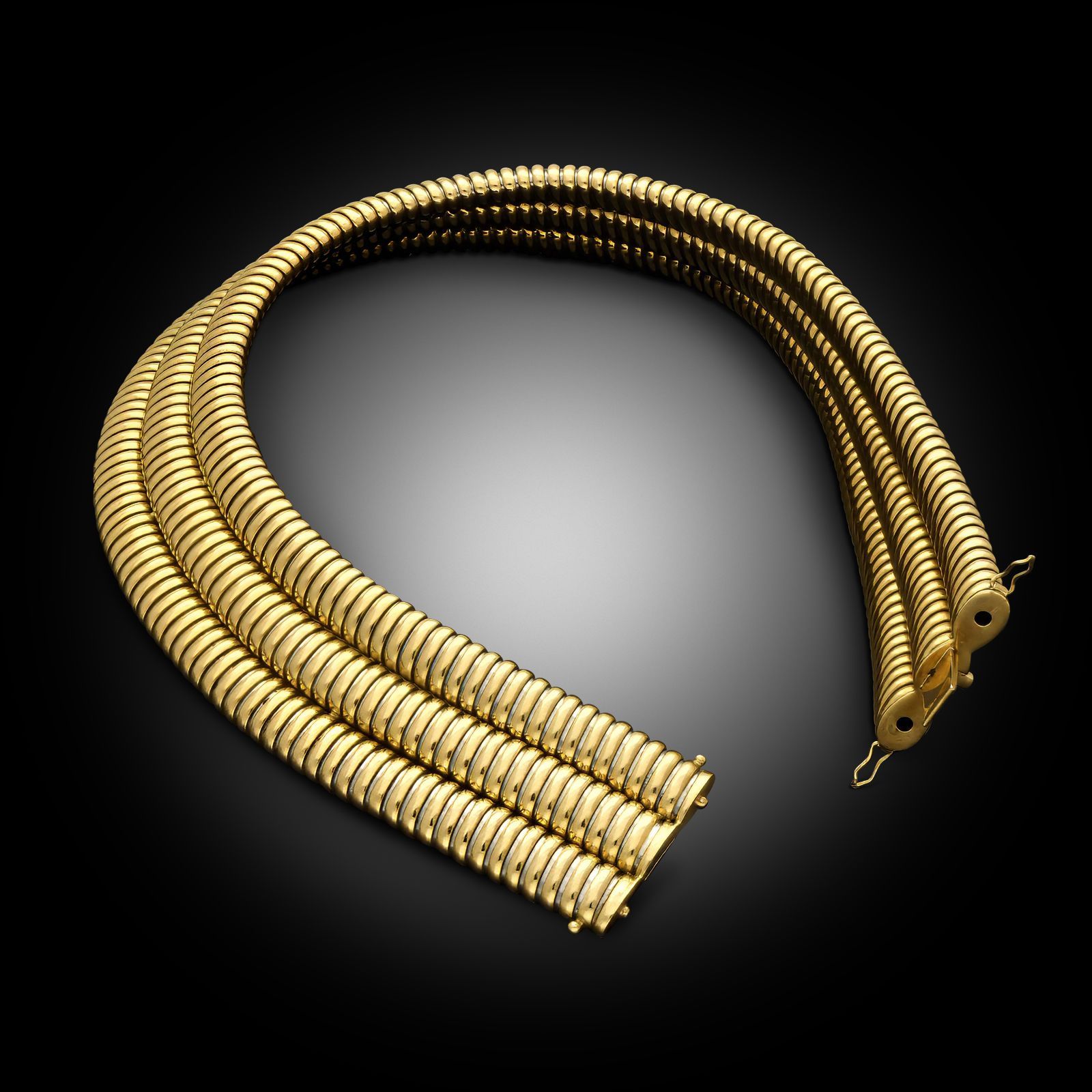 CARTIER Vintage 18ct Yellow Gold Triple Row Tubogas Necklace A vintage 18ct yellow gold and steel tubogas necklace by Cartier, circa 1987. The collar is composed of three highly flexible rows of tubogas, of graduating length and uniform width, secures to the back with a concealed clasp and double safety catch. PRICE: £48,500.00 INFORMATION Maker: Cartier Period: circa 1987 Setting: 18ct yellow gold and steel, signed Cartier and numbered Dimensions: Length: 36.0cm/14.17" (top row) to 42.5cm/16.73" (bottom row) Width: 3.0cm/1.18" Weight Description: 135 grams REF: 130387 DIRECTOR’S NOTES The flexible yet strong, distinctive ‘gas pipe’ style known as Tubogas was actually patented in 1881, however became adored by jewellers from the 1940s onwards. The technique requires great skill and precision as the metal is wrapped around a core with edges that interlock meaning there is no soldering required. It is a remarkable design that has become instantly recognisable. Whilst Tubogas does stand alone, it’s versatility from a design perspective also means that it has also been utilised in multiple iconic collections by major fine jewellery houses over the years. ——— Hancocks 62 St James’s Street, London, SW1A 1LY, United Kingdom Phone: +44 20 7493 8904 Email: info@hancockslondon.com