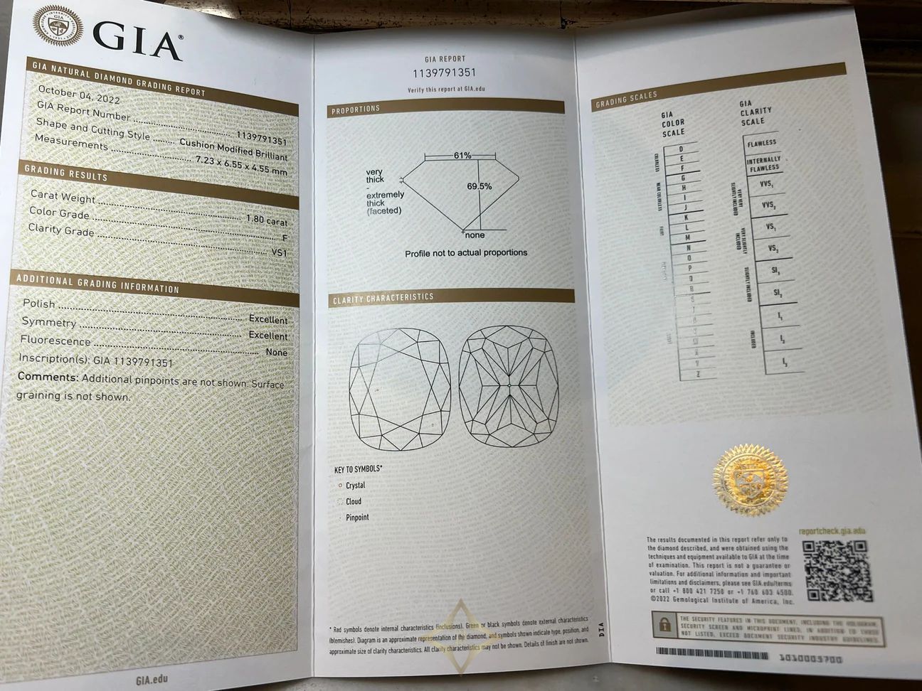 A spectacular creation by renowned Australian jeweller Cerrone, this handmade double halo diamond ring is crafted in 18ct white gold and showcases a stunning GIA Certified 1.80ct cushion cut diamond in a secure four-claw setting. The centre stone is graded F colour and VS1 clarity, offering exceptional brilliance and fire.
