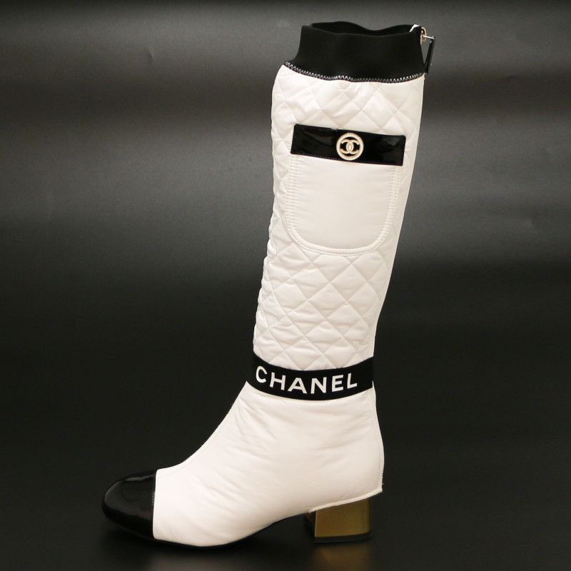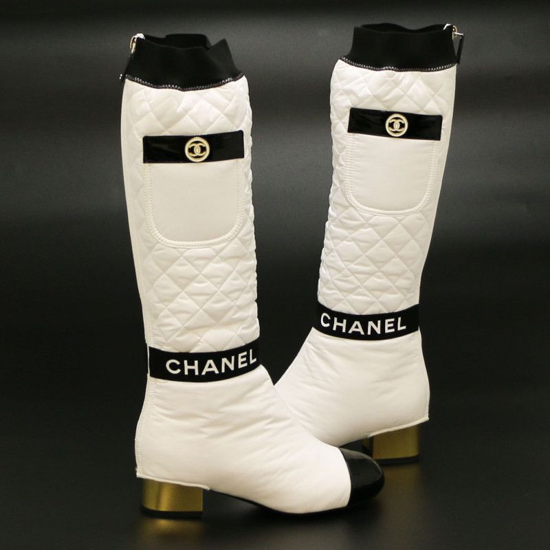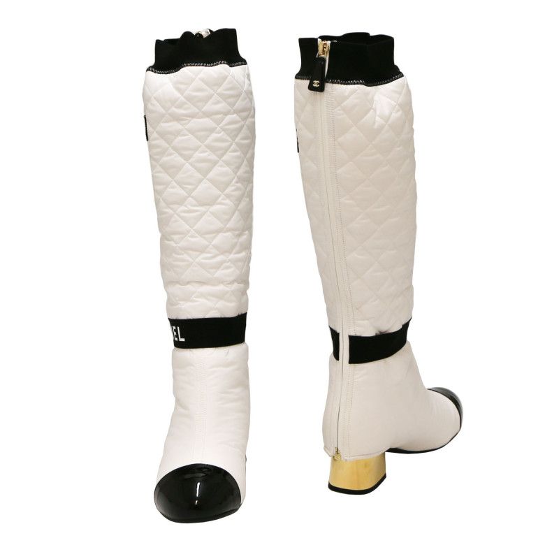 Details : quilted removable gaiters with. Black stripe along the ankle with CHANEL written on it. Collector's piece.
