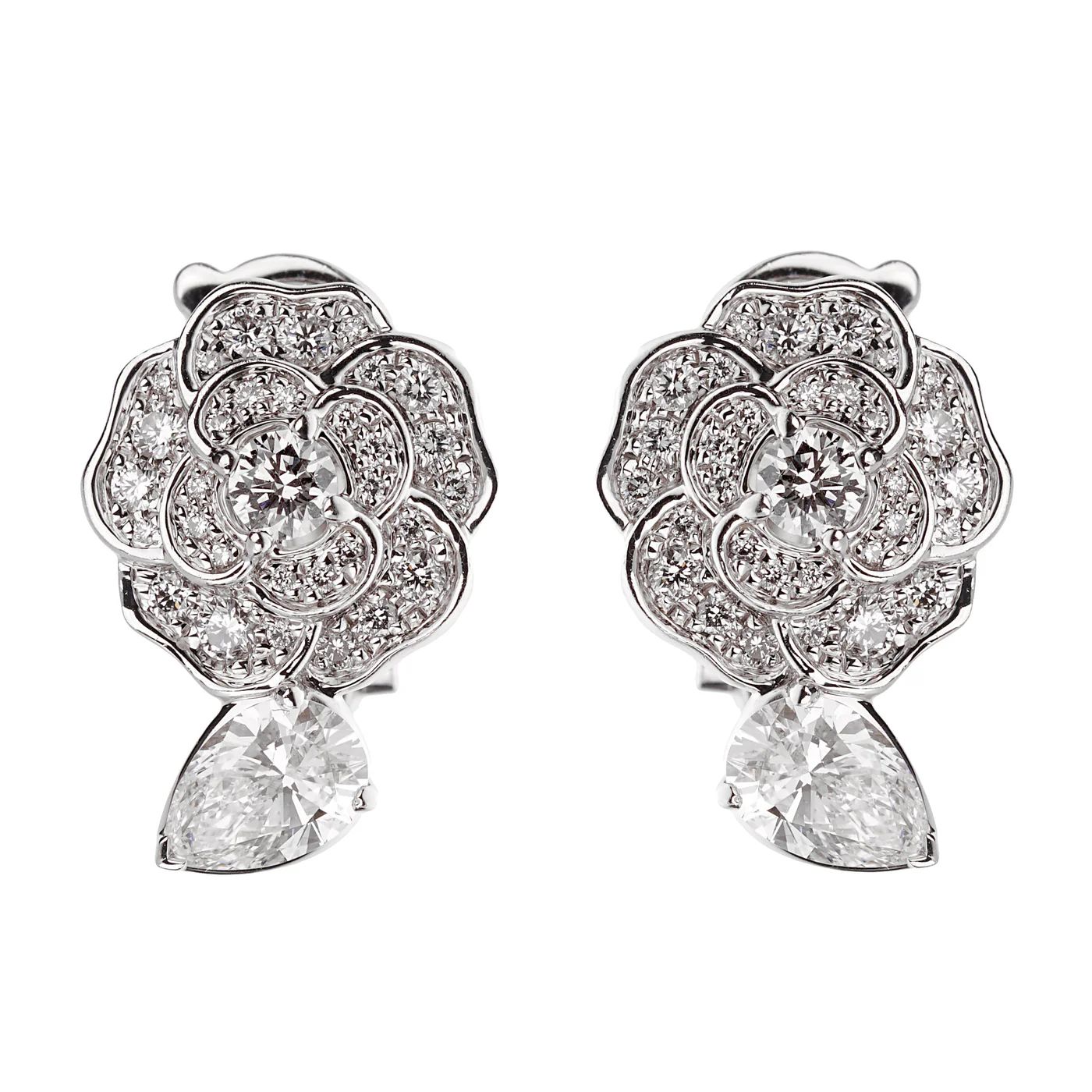 Crafted from 18k white gold, the earrings exhibit a purity and brilliance that serve as the perfect canvas for the dazzling display of diamonds. The choice of white gold underscores the earrings' sophistication, providing a luminous backdrop that enhances the sparkle of each gemstone. The use of this precious metal is a hallmark of Chanel's commitment to quality and luxury, ensuring that each piece is not only visually stunning but also of heirloom quality.
