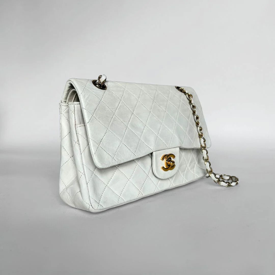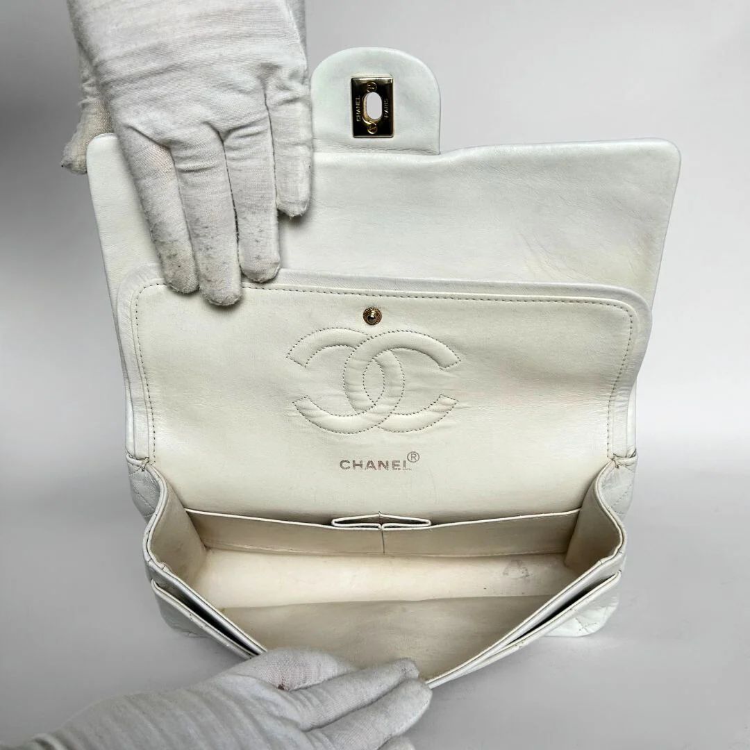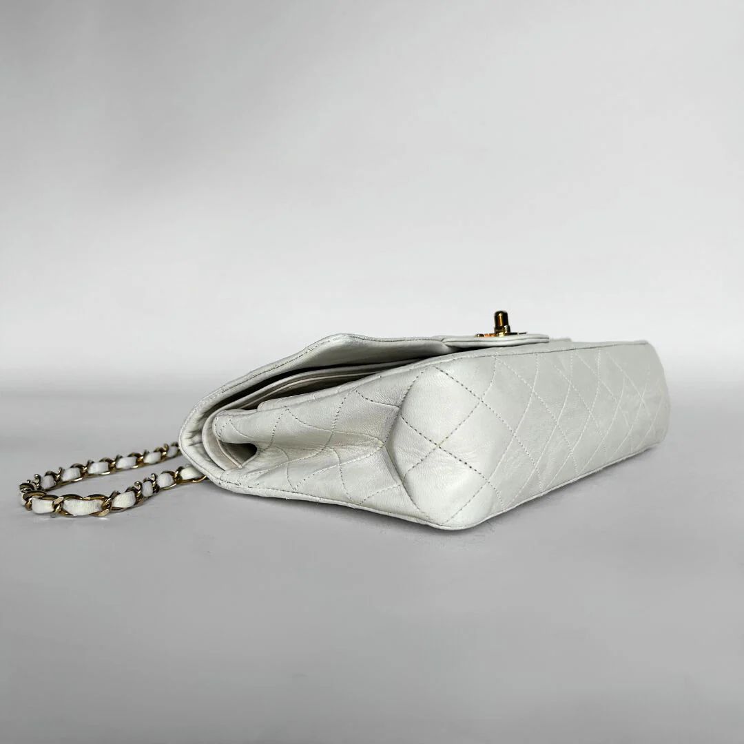 Chanel Classic Flap Bag in a size Medium in white Lambskin Leather. The Chanel Classic Double Flap is one of the most iconic handbags ever created and has been regarded for decades as a symbol of timeless style and elegance. The bag is made of high-quality leather and has a distinctive quilting technique that gives it a luxurious look. The hardware of the bag is gold-plated with 24K gold, Which is very rare as this is no longer produced these days.