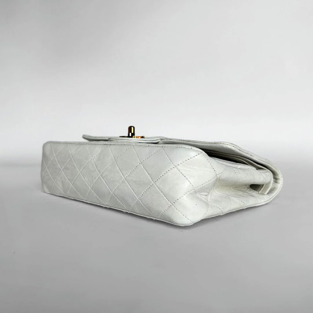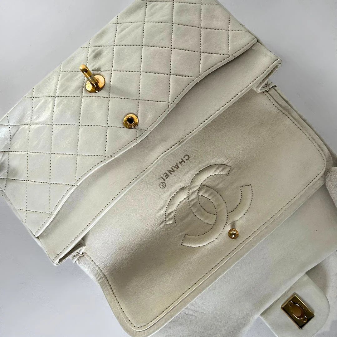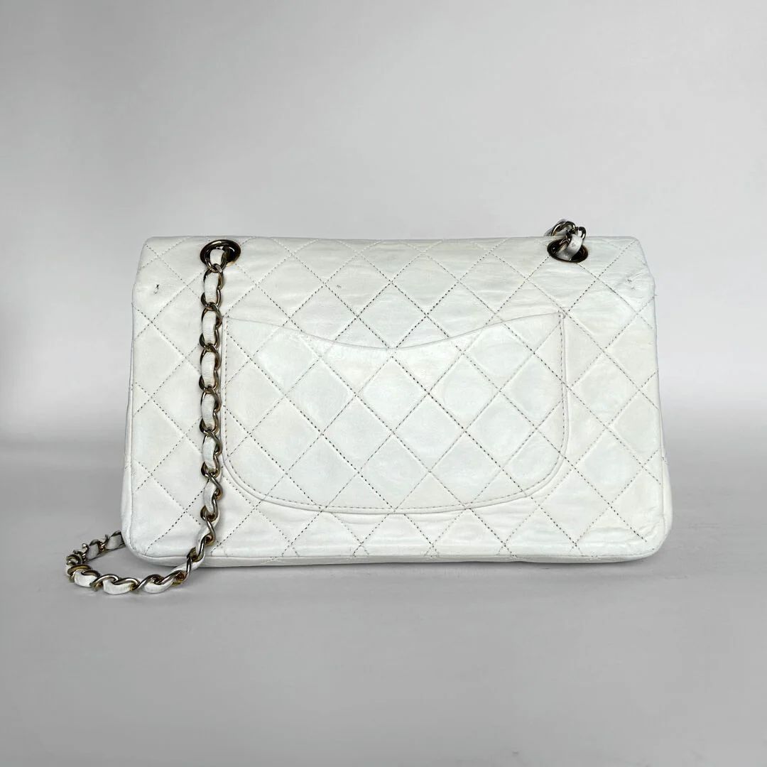 Chanel Classic Flap Bag in a size Medium in white Lambskin Leather. The Chanel Classic Double Flap is one of the most iconic handbags ever created and has been regarded for decades as a symbol of timeless style and elegance. The bag is made of high-quality leather and has a distinctive quilting technique that gives it a luxurious look. The hardware of the bag is gold-plated with 24K gold, Which is very rare as this is no longer produced these days.