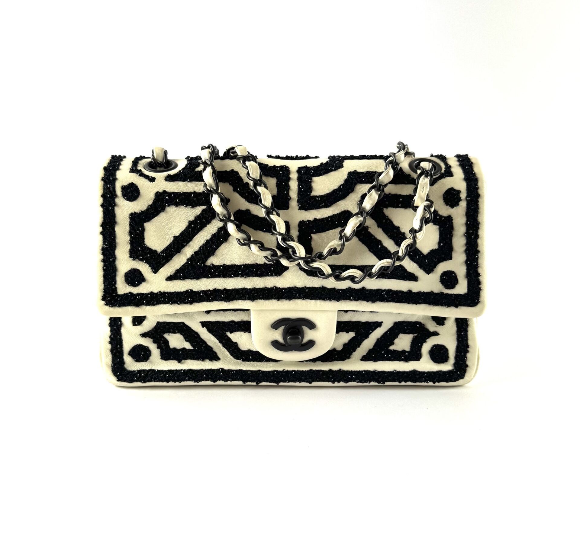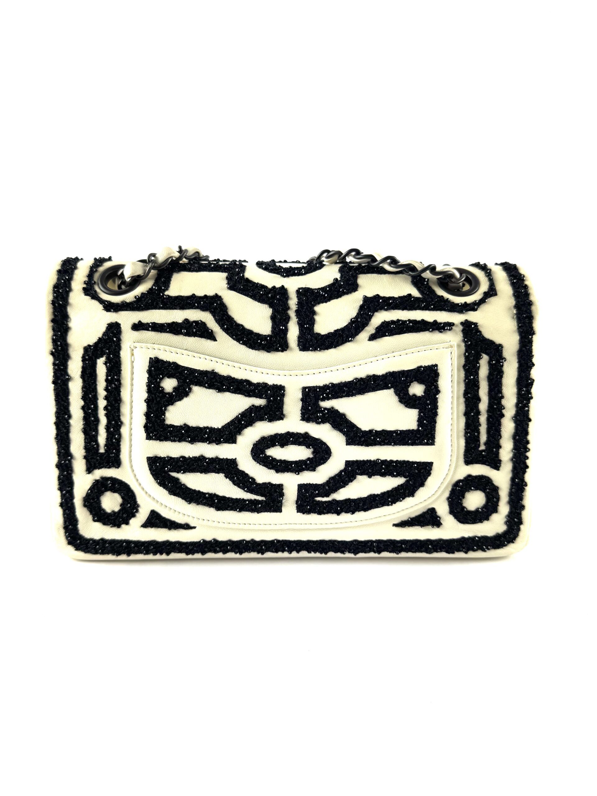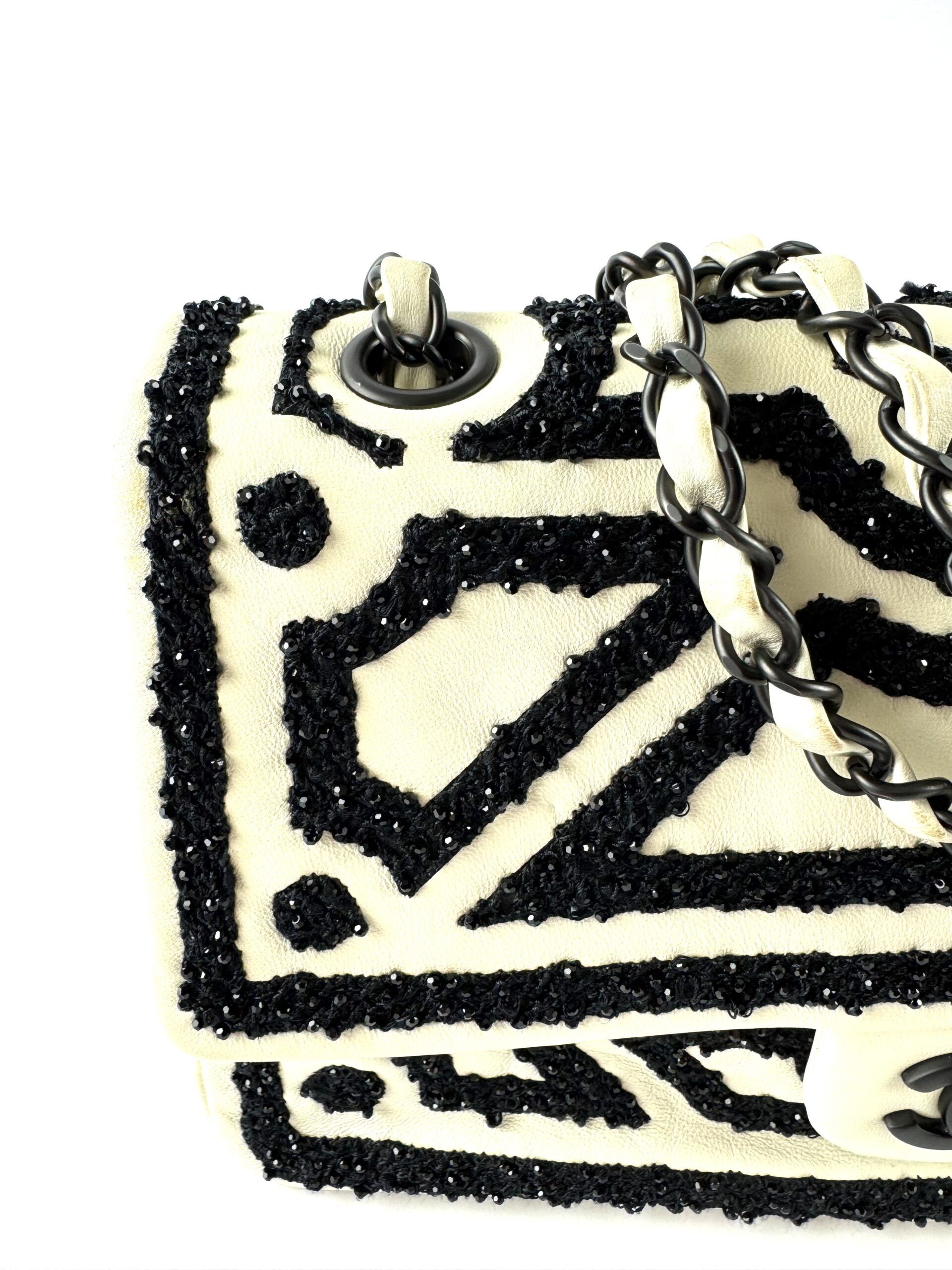 This rare Chanel Garden of Versailles handbag is a limited edition piece from the 2011 Métiers d’Art collection. Crafted with attention to detail, the bag features a black geometric pattern embroidered on an ivory velvet leather base, inspired by the elegance of the French palace gardens.