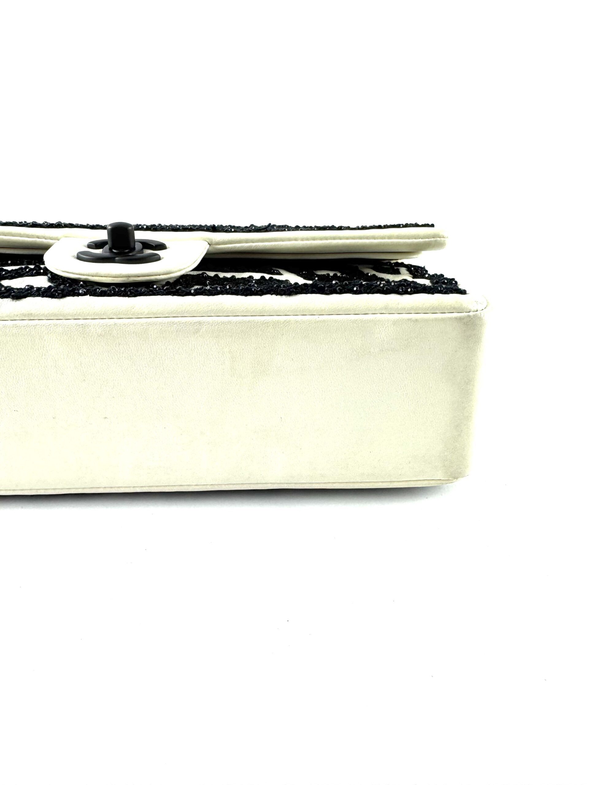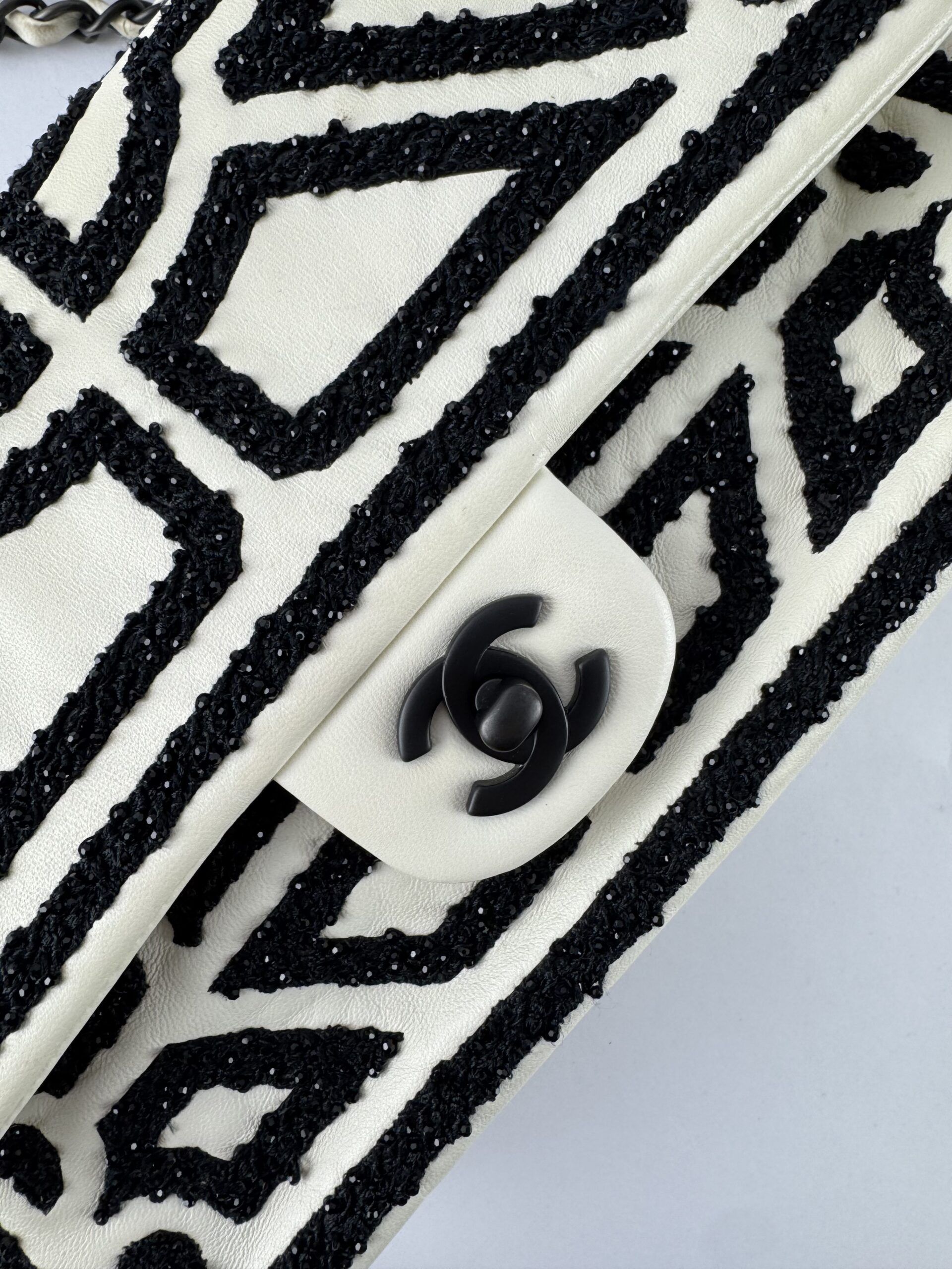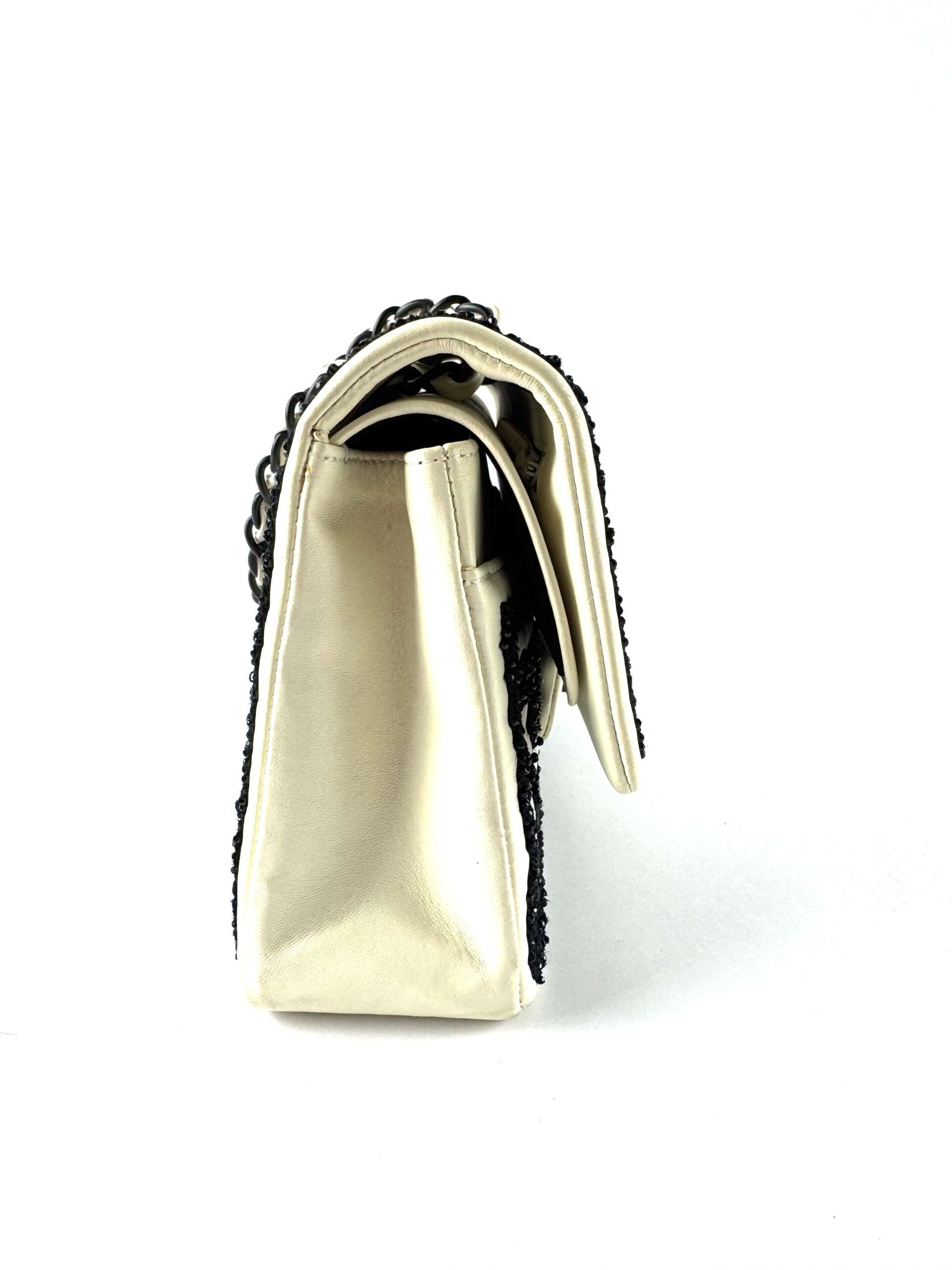 This rare Chanel Garden of Versailles handbag is a limited edition piece from the 2011 Métiers d’Art collection. Crafted with attention to detail, the bag features a black geometric pattern embroidered on an ivory velvet leather base, inspired by the elegance of the French palace gardens.