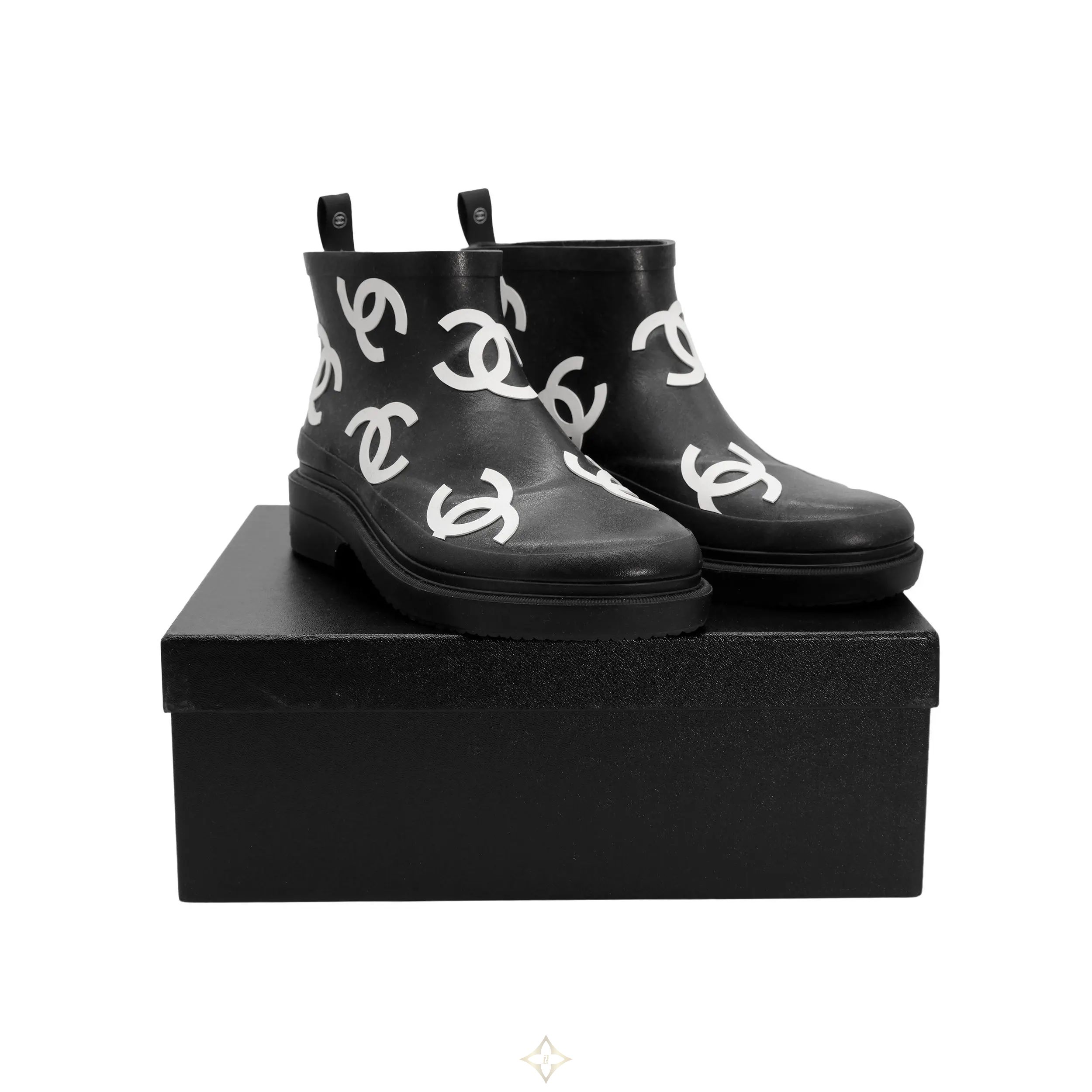 Chanel logo rain boots 2023-24 FW PRICE: 2150,00 € Chanel Reference: 118602 Colour: Black Condition: Excellent Box: Yes Shoe Size: 38 Description: Chanel black and white all logo ruber CC, low top short ankle rain boots. Condition: excellent. Dustbag: yes. ——— LE DRESSING 1 Rue Princesse Florestine 98000 Monaco Phone: +3 779 325 82 26 WhatsApp: +377 6 78 63 62 20 Email: ledressing@monaco.mc