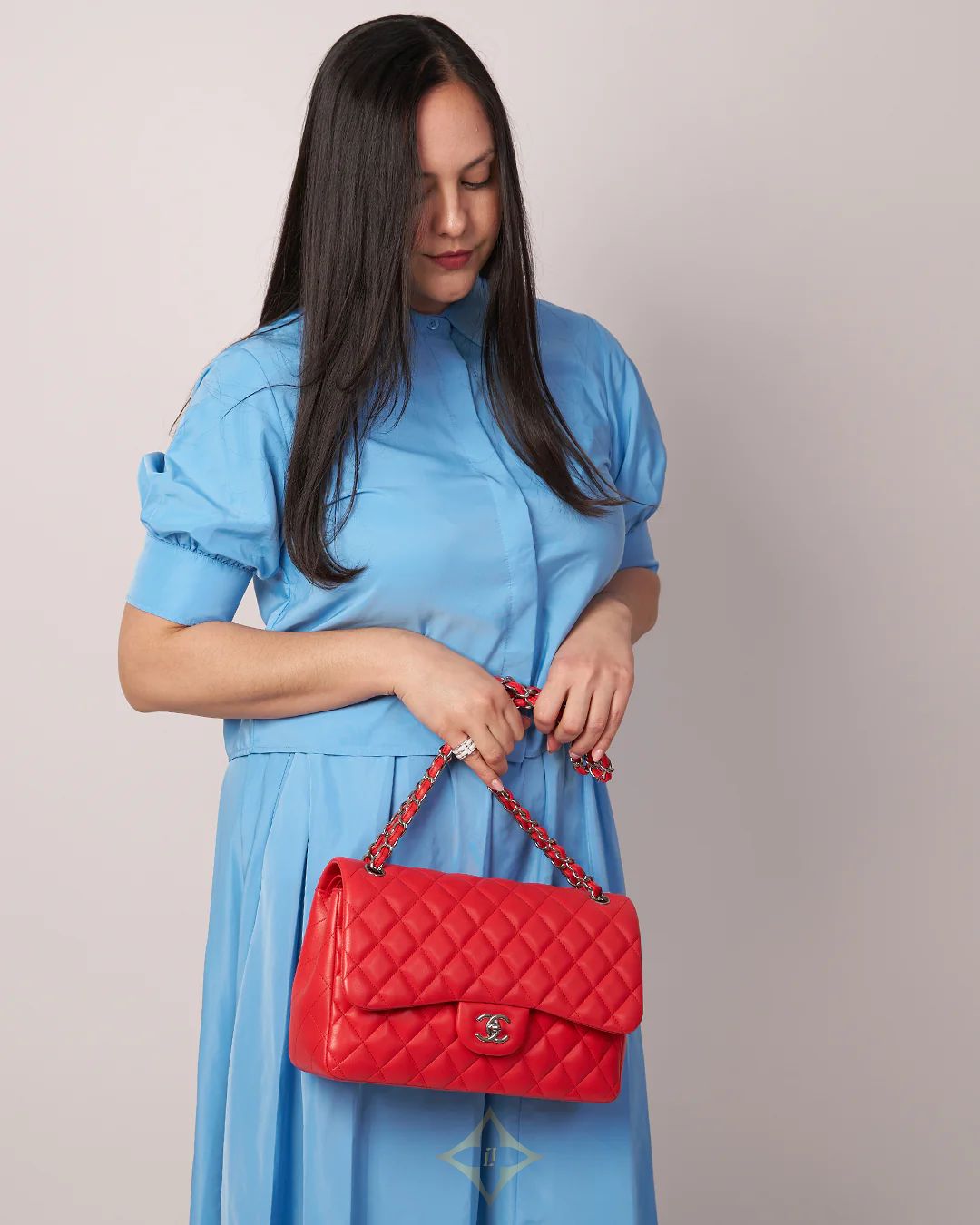Chanel Red Jumbo Lambskin Classic Double Flap 2016/17 Regular price: 225.802.000 VND Indulge in luxury with the Chanel Red Jumbo Lambskin Classic Double Flap. The iconic design features a double flap closure, adding an elegant touch to this timeless piece. Crafted from soft lambskin, this bag is not only stylish but also practical with its spacious interior. Elevate your wardrobe with this beautiful Chanel creation. Condition Rating: Excellent pre-loved condition Condition Notes: Little to no signs of use Designer: Chanel Material: Lambskin leather Production Year: 2016/17 Serial Number: 22477051 Country of Origin: Italy Includes: Our very own certificate of authenticity Measurements: 20 cm H x 30 cm L x 9 cm W Exterior Pockets: One slip pocket Interior Pockets: Four slip pockets Handles: One double chain/leather strap Handles Drop: 60 cm strap, 33 cm double strap Closure/Opening: Middle tune lock Interior Lining: Leather Hardware: Silver tone Designer Exchange Ltd Designer Exchange, Exchequer Street 35 Exchequer Street, Dublin 2, Ireland, D02TE20 Phone: +353 1 612 8080 Email: info@designerexchange.ie